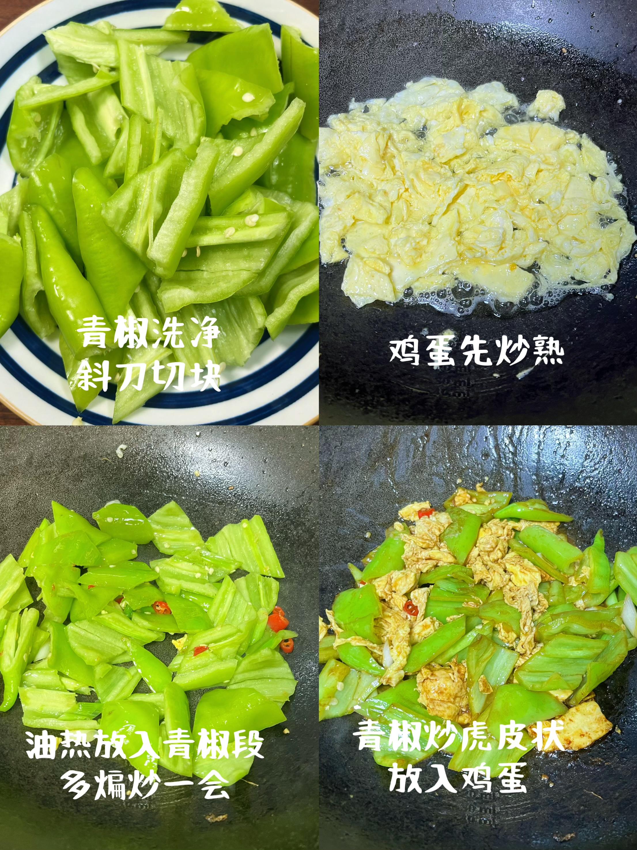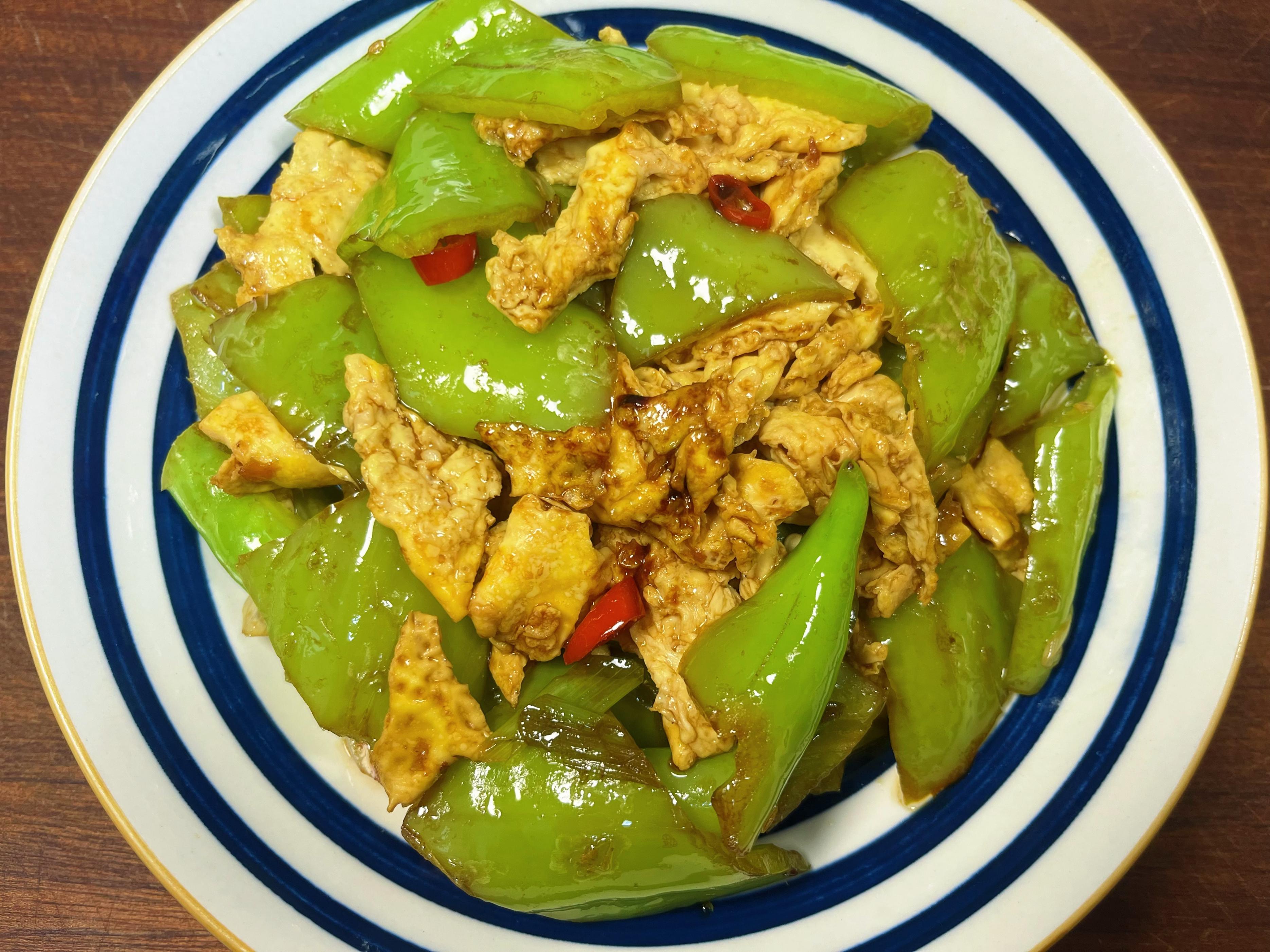4、將雞蛋塊倒回鍋中,與青椒一同翻炒幾下,依口味撒點鹽或生抽,顛勺拌勻,即可關火盛盤。