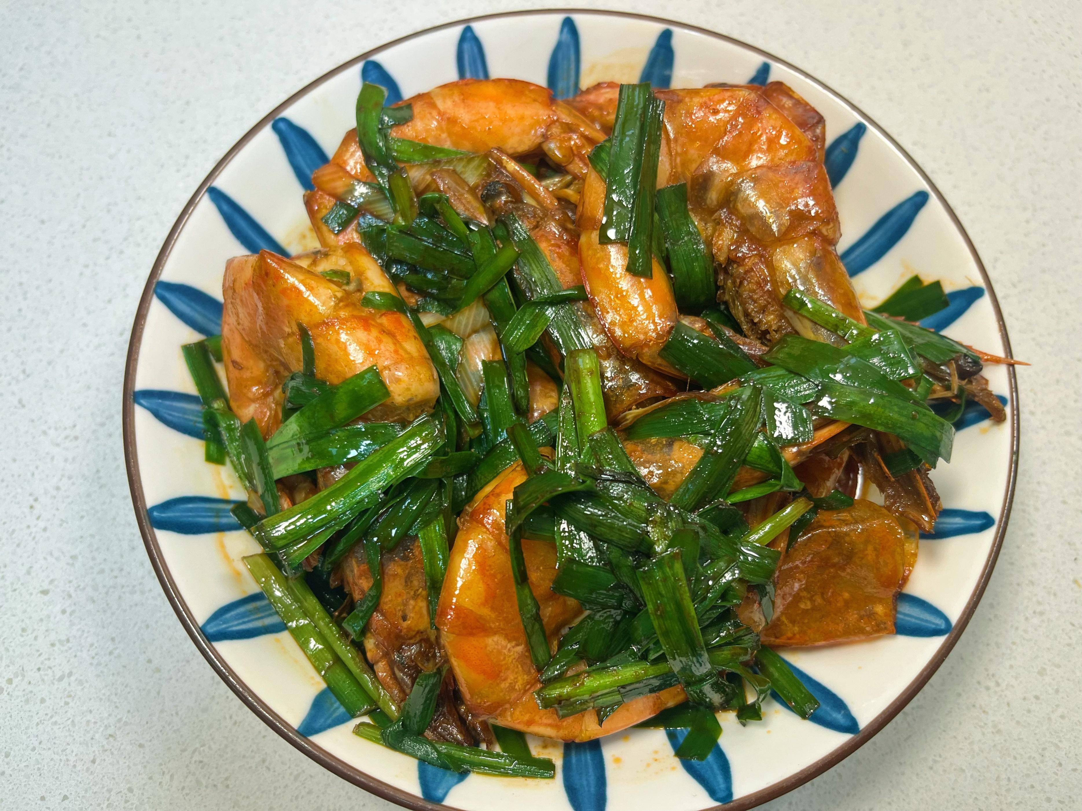 4、鍋中留底油(或再加少許),下韭菜段,大火快速翻炒至微軟。