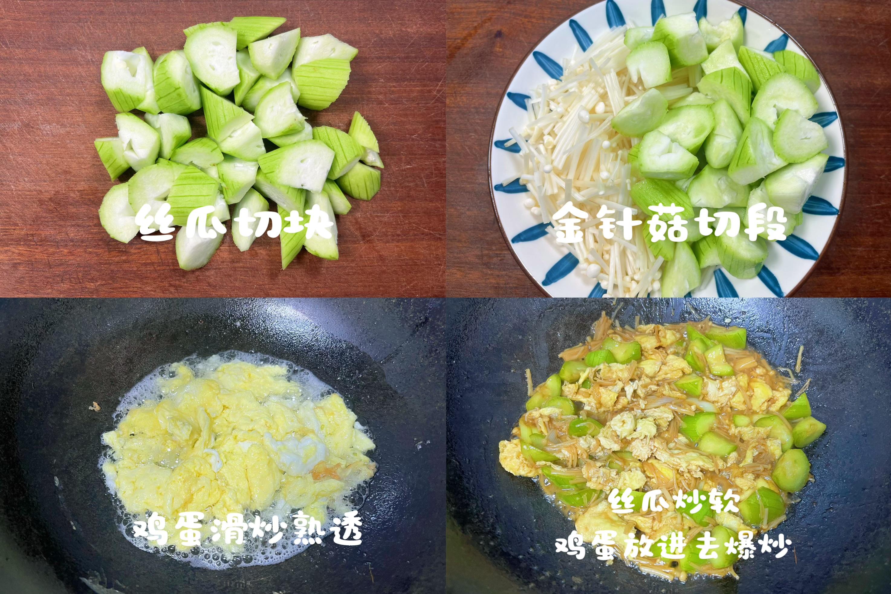 3、鍋裏留底油,下絲瓜塊翻炒至稍微變軟,加入金針菇一起炒。