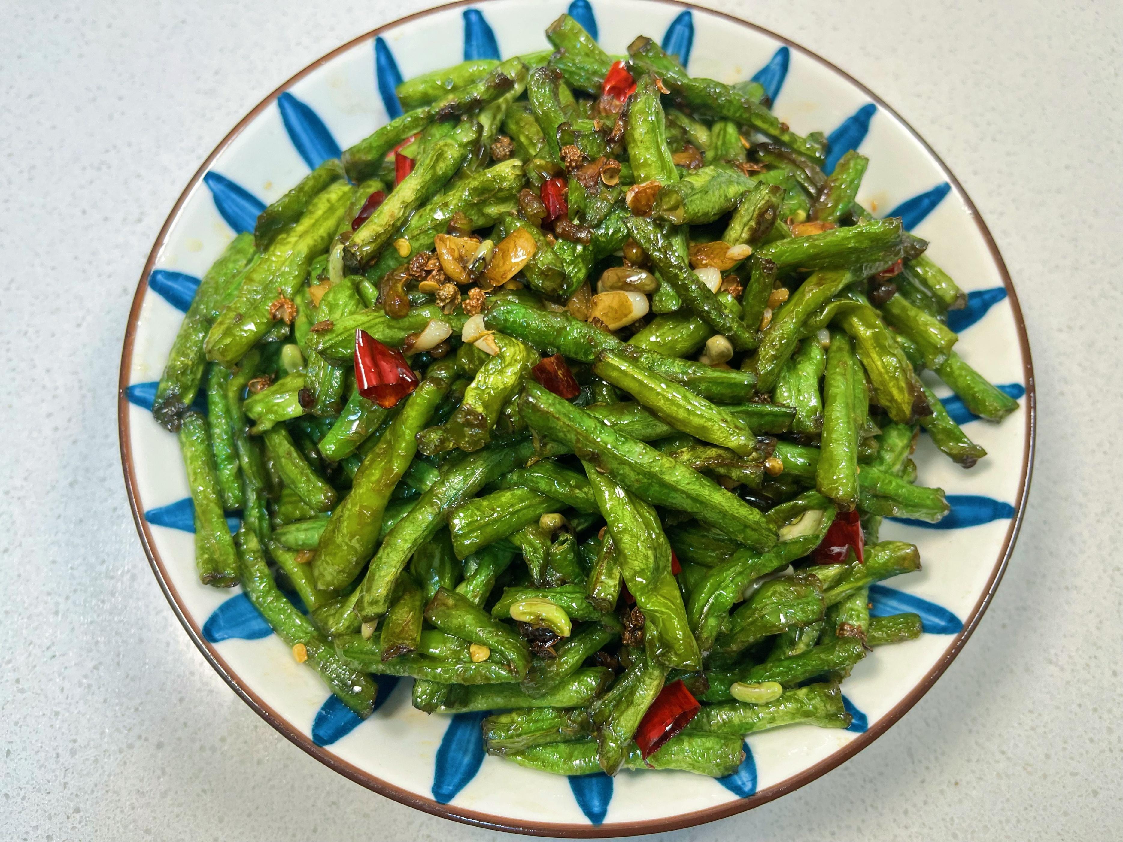 這道菜可是“飯掃光”的種子選手!豆角經過耐心煸炒,焦香韌韌的,嚼着特別香。蒜粒、花椒、幹辣椒的複合香氣直往鼻子裏鑽,專治沒胃口!豆角本身也是植物蛋白和纖維的好來源,煸炒後特別入味,孩子不知不覺就扒完一碗飯。切記:豆角一定要徹底做熟,安全第一!
