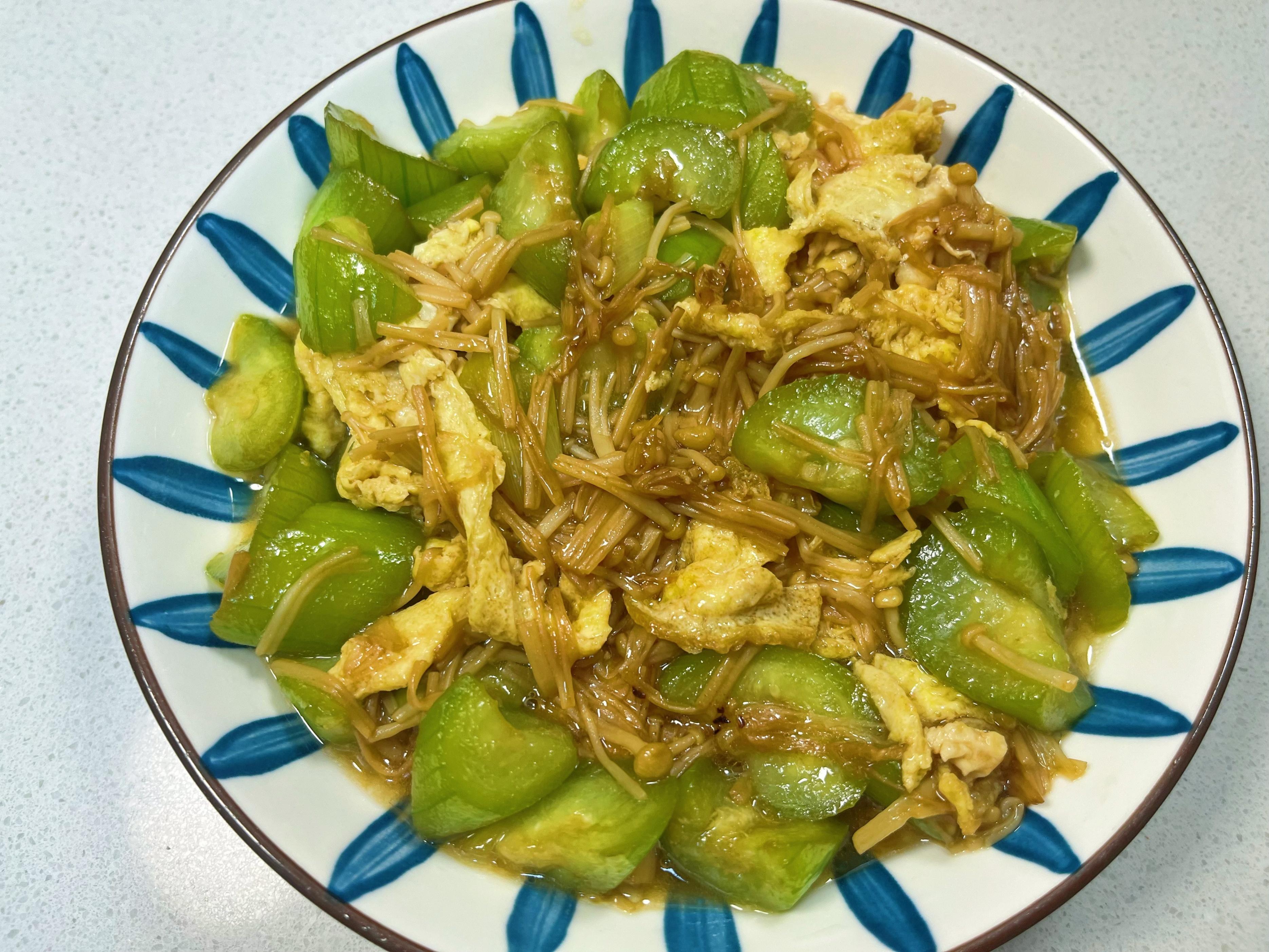 4、炒到金針菇變軟、絲瓜透明時,倒入炒好的雞蛋塊。