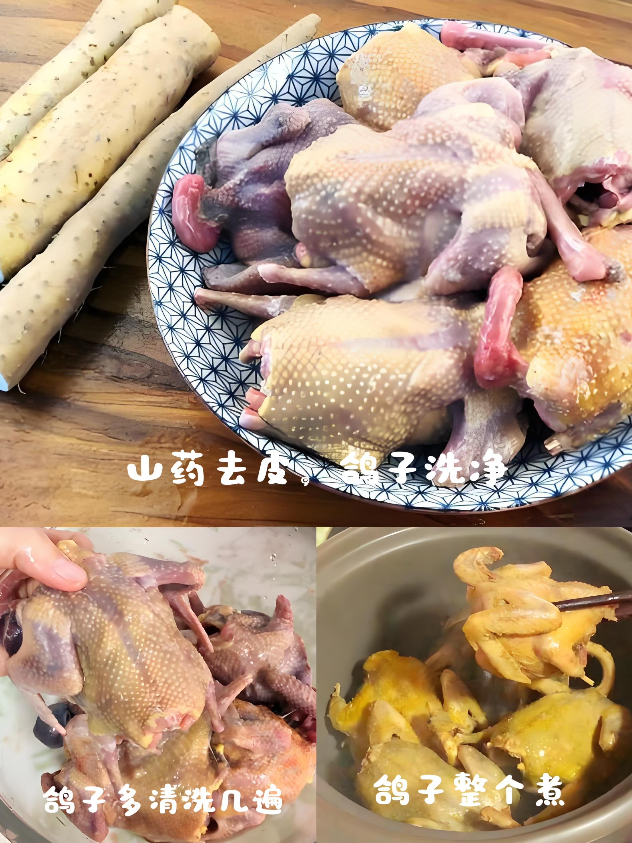 食材準備:乳鴿1只(或鴿子半隻)、鐵棍山藥1根、紅棗8-10顆、姜幾片、枸杞一小撮、鹽適量。