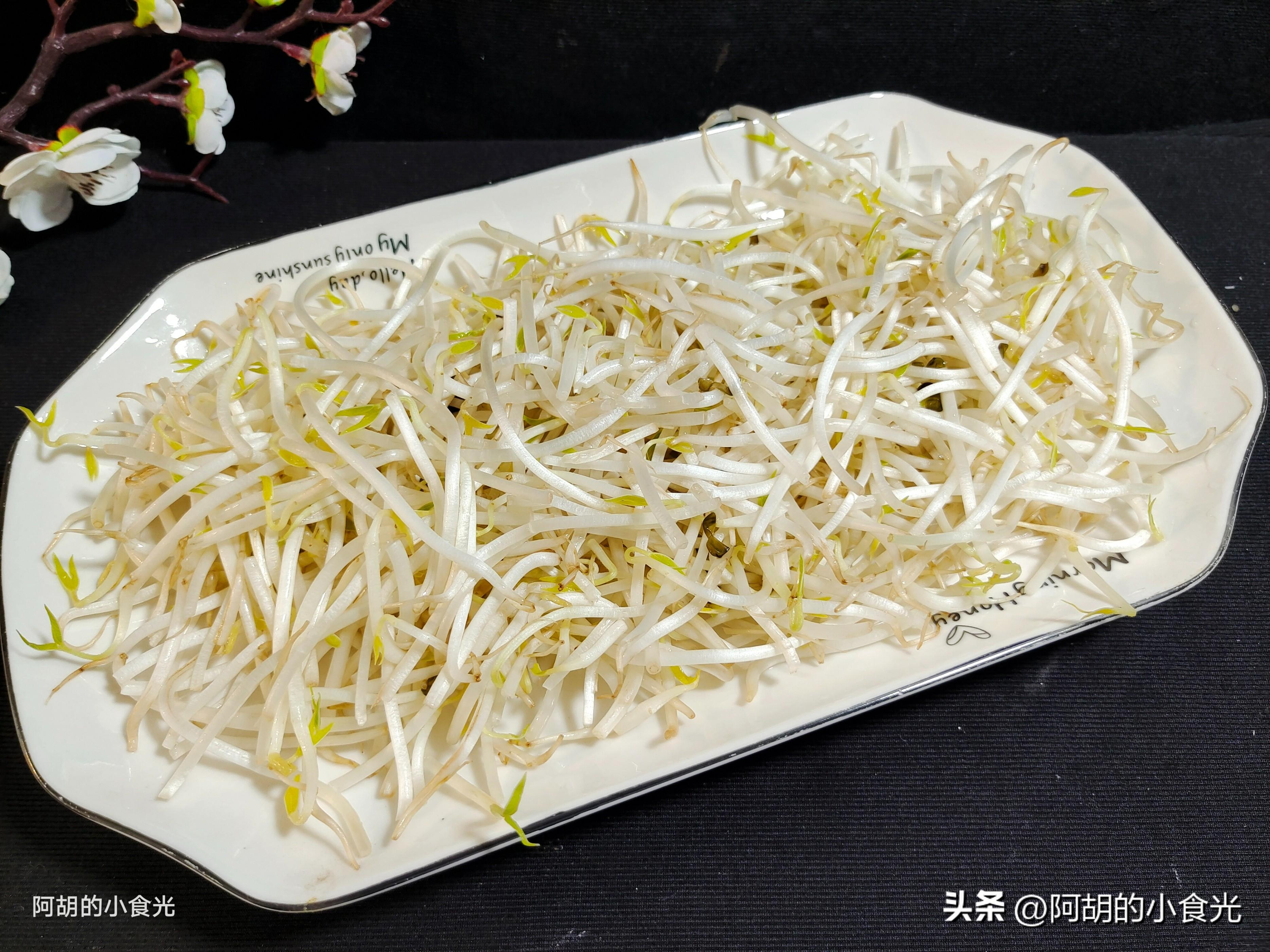 豆芽入盤子時最好將水分瀝乾,防止出鍋後有太多的湯汁。鋪入盤子時也可以用力壓一壓,將豆芽壓緊實一些,如此可以保證一頓的量。