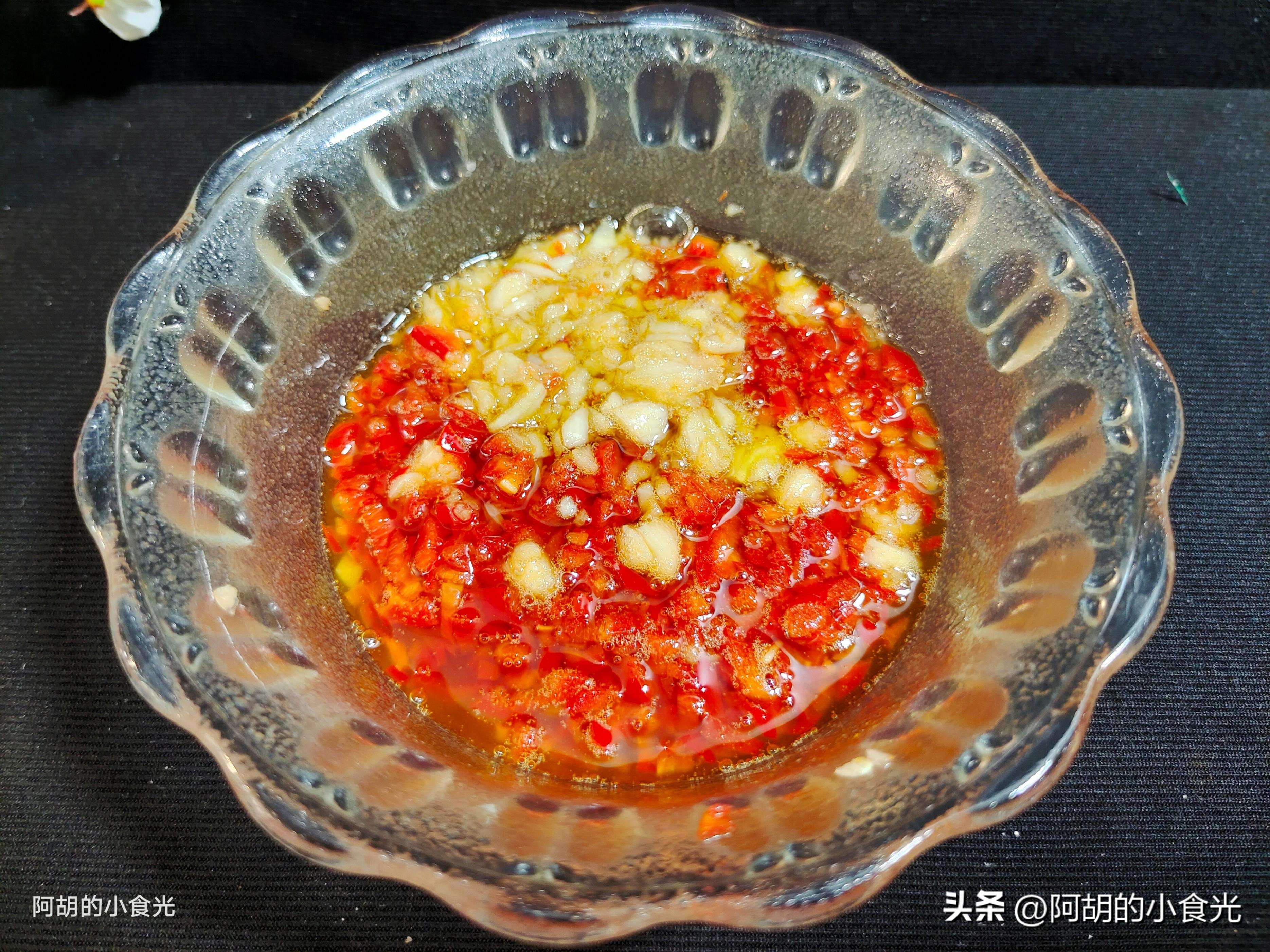 第三步:趁着醃製的時間我們來準備一個料汁。準備一個大紅椒去籽後將其切碎放入碗中,喜歡辣味的可以用紅小米椒來代替大紅椒。再準備幾粒大蒜瓣剁碎也放入其中。而後燒一些菜籽油至冒煙,趁熱將菜籽油倒入碗中激發出紅椒和蒜末的香味。再依次淋入一些生抽、蠔油、食鹽、松茸鮮等調味料攪拌均勻備用。