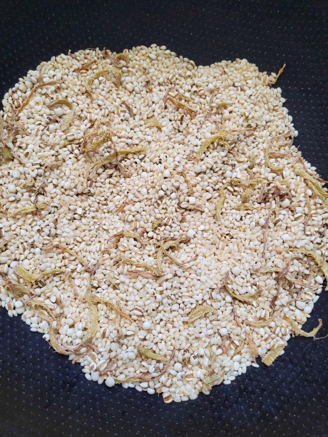 3乾淨無油的鍋,加熱,放進大米,小火炒,炒到顏色微微發黃