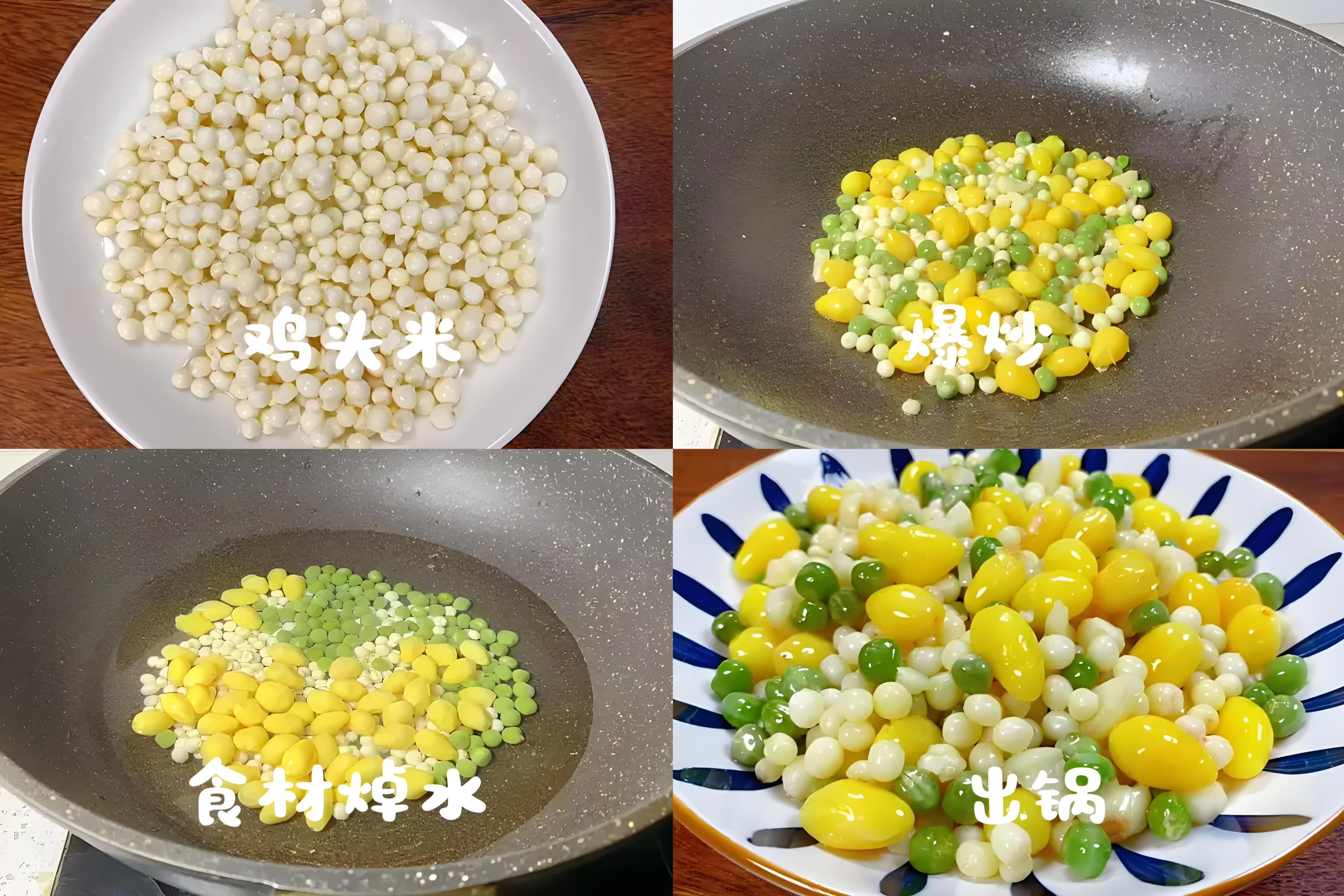 1、新鮮青豆米(豌豆仁)洗淨;袋裝去芯白果焯水1分鐘撈出;新鮮雞頭米(芡實)如果是冷凍的,解凍沖洗一下。