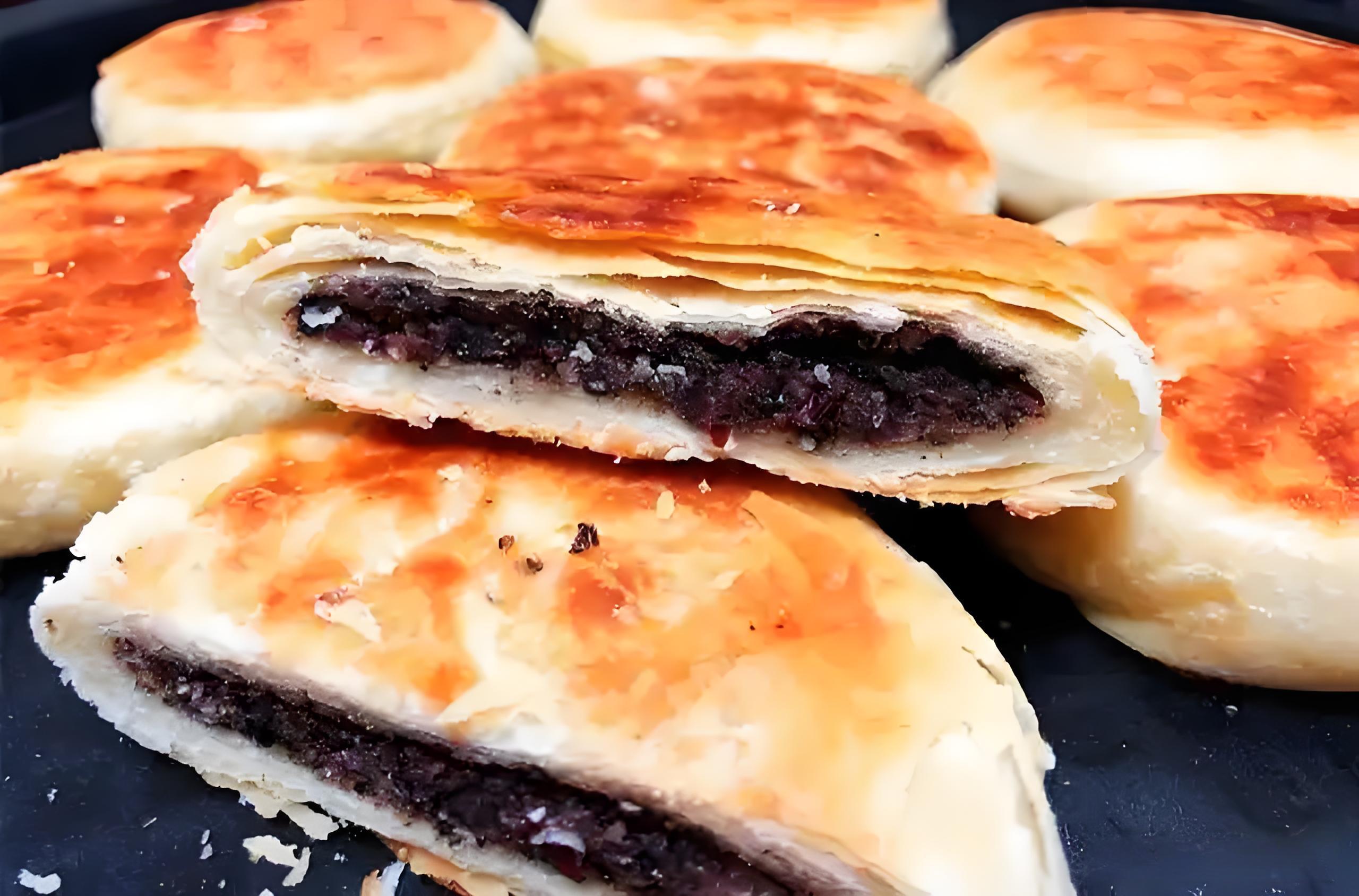 4、平底鍋刷薄薄一層油,燒熱後放入餅胚。中小火慢慢烙,看到餅皮鼓起,底面呈現誘人的金黃色就翻面。兩面都烙得金黃焦脆,餅身變得輕盈飽滿,就可以出鍋啦!趁熱咬一口,外皮酥脆微焦,內裏紅豆沙餡滾燙甜蜜,帶着質樸的豆香瞬間在口中瀰漫開來。