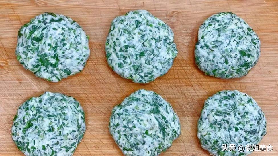 5、平底鍋或電餅鐺燒熱,倒入比平時炒菜稍多一點點的油(油多點更香脆)。用中火加熱。油熱後(手放在鍋上方能感覺到熱氣),放入做好的艾草小餅生坯。保持中火,慢慢烙。耐心點,別急着翻動。等到底面定型,變成漂亮的金黃色(大概2-3分鐘),用鏟子小心地翻個面。