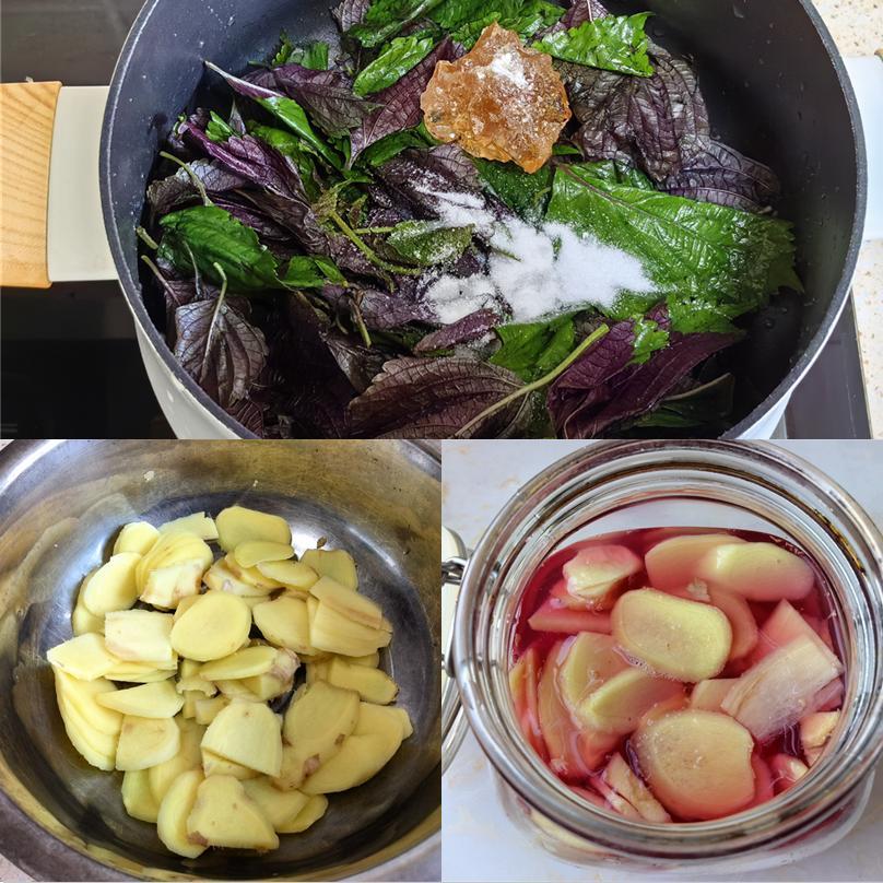 2. 鍋中加入清水、洗淨的紫蘇葉、黃冰糖,大火煮開後轉小火煮5-10分鐘,煮出漂亮的紫紅色和香氣。關火,撈出紫蘇葉。