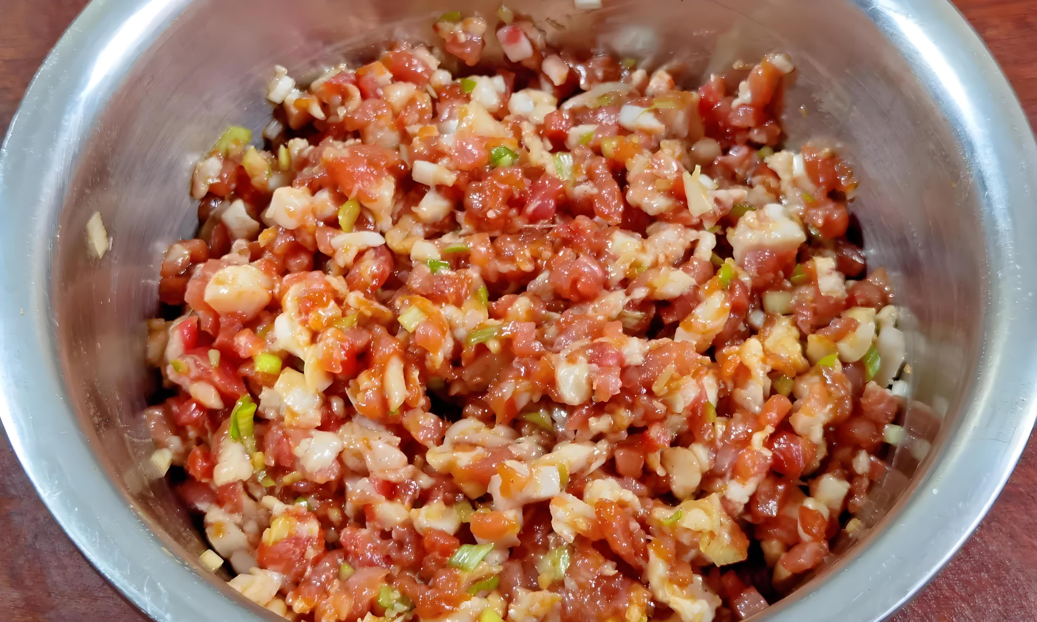 2、肉丁放入盆中,先加1-2勺生抽、半勺老抽、適量鹽、少許白胡椒粉、一小勺香油,再分次加入約2-3勺蔥姜水,順一個方向用力攪拌,直至水分被吸收,肉餡上勁起黏。最後倒入芹菜丁、薑末、蔥花,淋入1-2勺熟油,輕輕拌勻即可。切記,拌餡時保持同一方向,肉餡更抱團多汁。