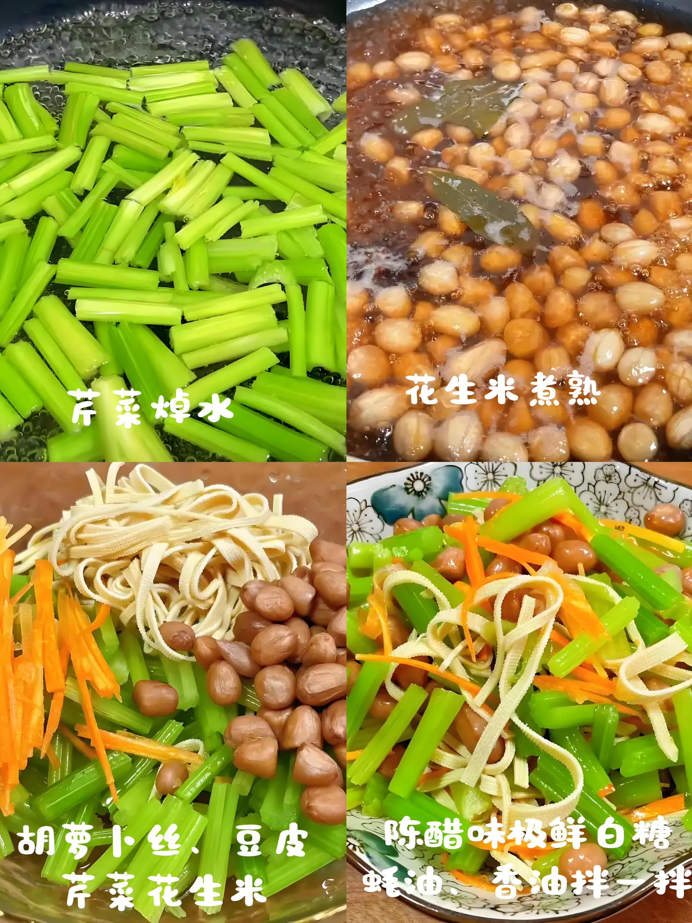 3、所有瀝乾水的食材(芹菜、豆腐皮絲、胡蘿蔔絲、熟花生米)放入大碗中。調味是關鍵:加入適量鹽、一點點糖提鮮、一勺香醋、幾滴香油(靈魂!)。喜歡蒜香可加點蒜末,喜歡辣可滴幾滴辣椒油。