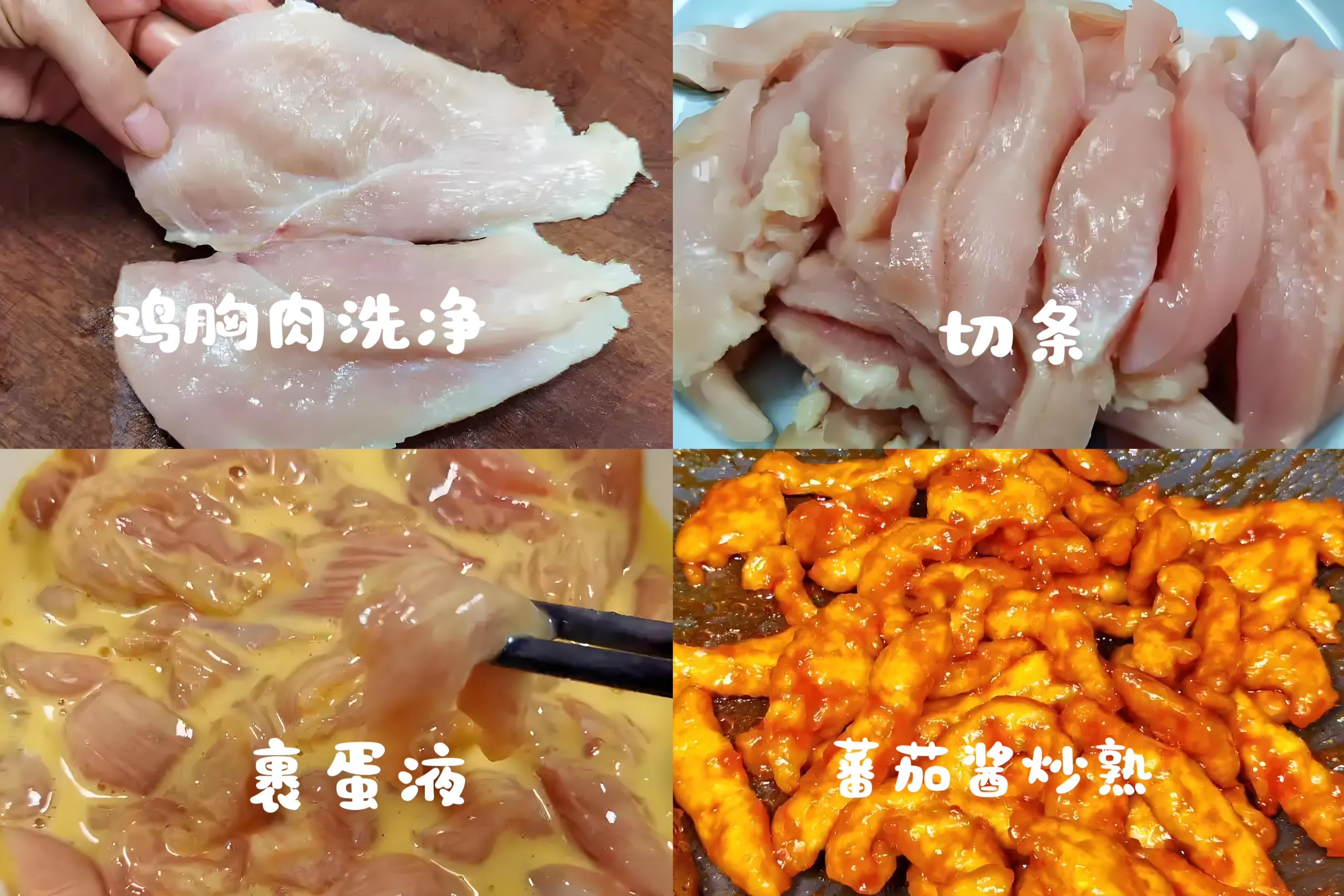 1、雞胸肉洗淨,順着紋理切成手指粗細的條。加少許鹽、料酒、一個蛋清抓勻,醃15分鐘讓它“睡個覺”更嫩滑。