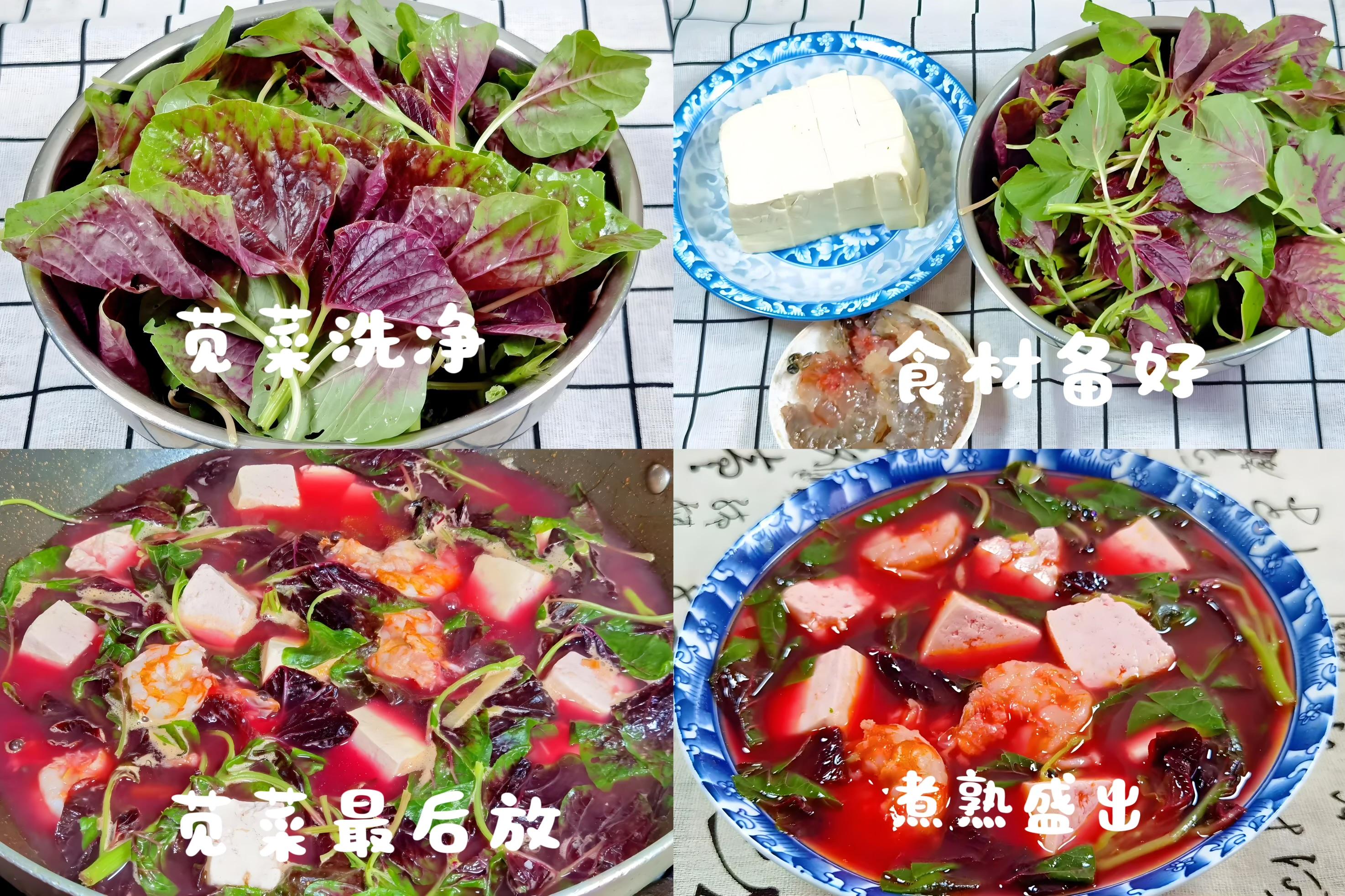 紅莧菜煮出的湯色天然紅潤,看着就開胃。莧菜鈣含量比牛奶還高,豆腐植物蛋白豐富,鮮蝦提味增營養。整道湯清清爽爽,帶着蒜香和海鮮的天然鮮甜,清熱利溼效果特別好。
