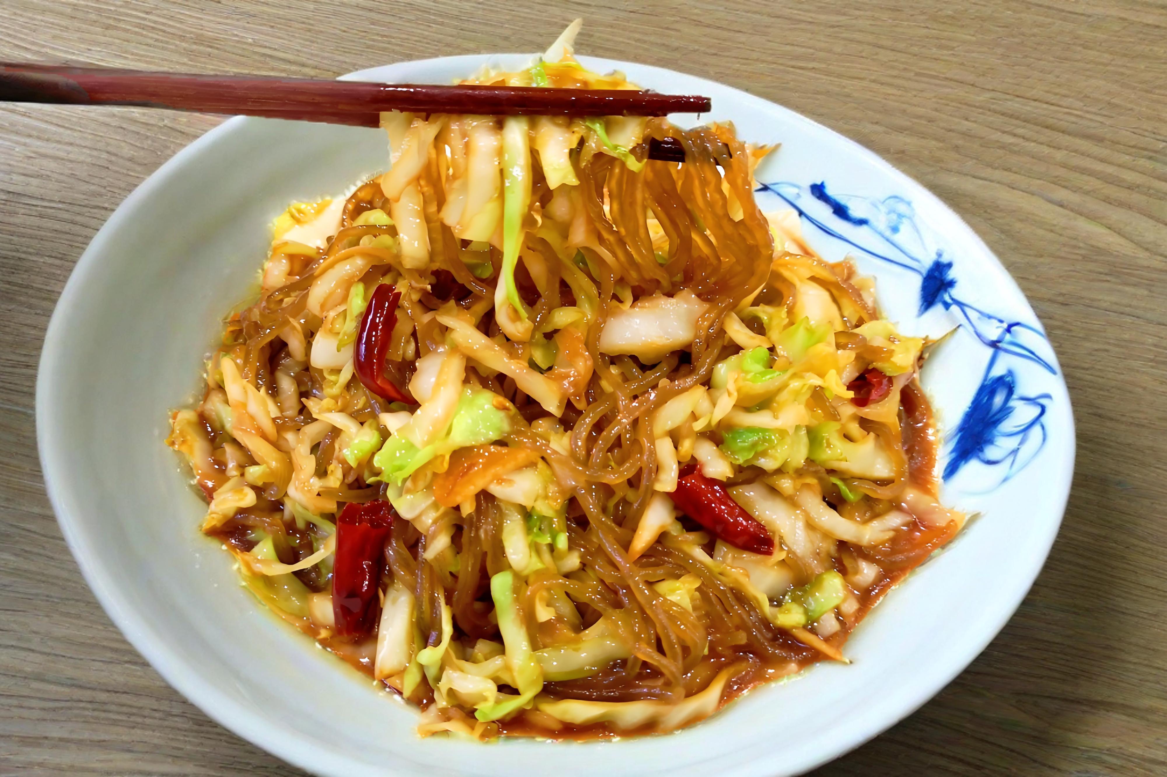裝盤上桌,開喫!看這盤菜,粉條油亮亮、滑溜溜,包菜絲還帶着點脆勁兒,豬肉焦香撲鼻,鹹鮮中帶着一絲若有若無的醋香提味。夾一筷子粉條,軟糯筋道,裹着肉香和醬汁,送進嘴裏,那叫一個滿足!