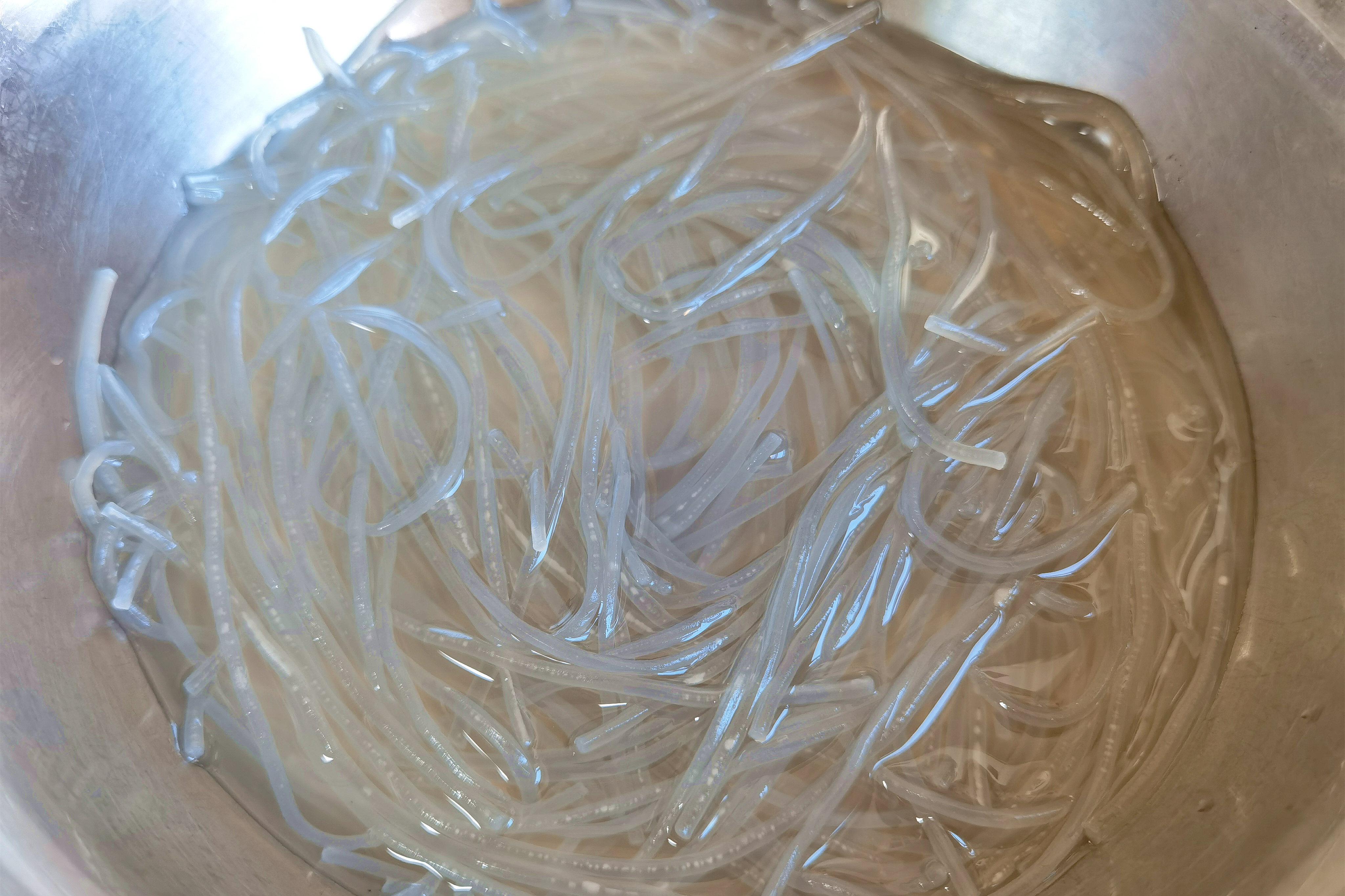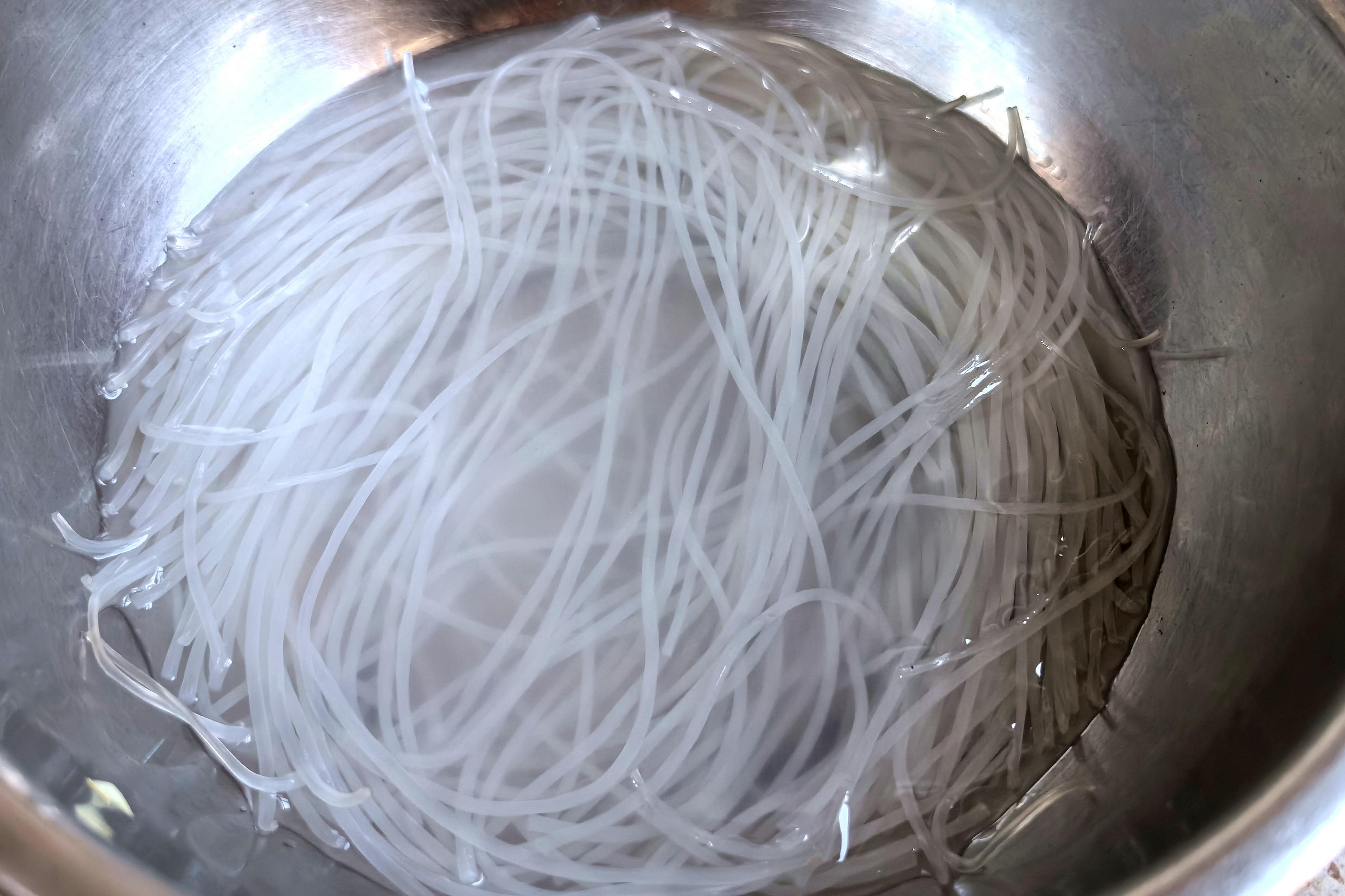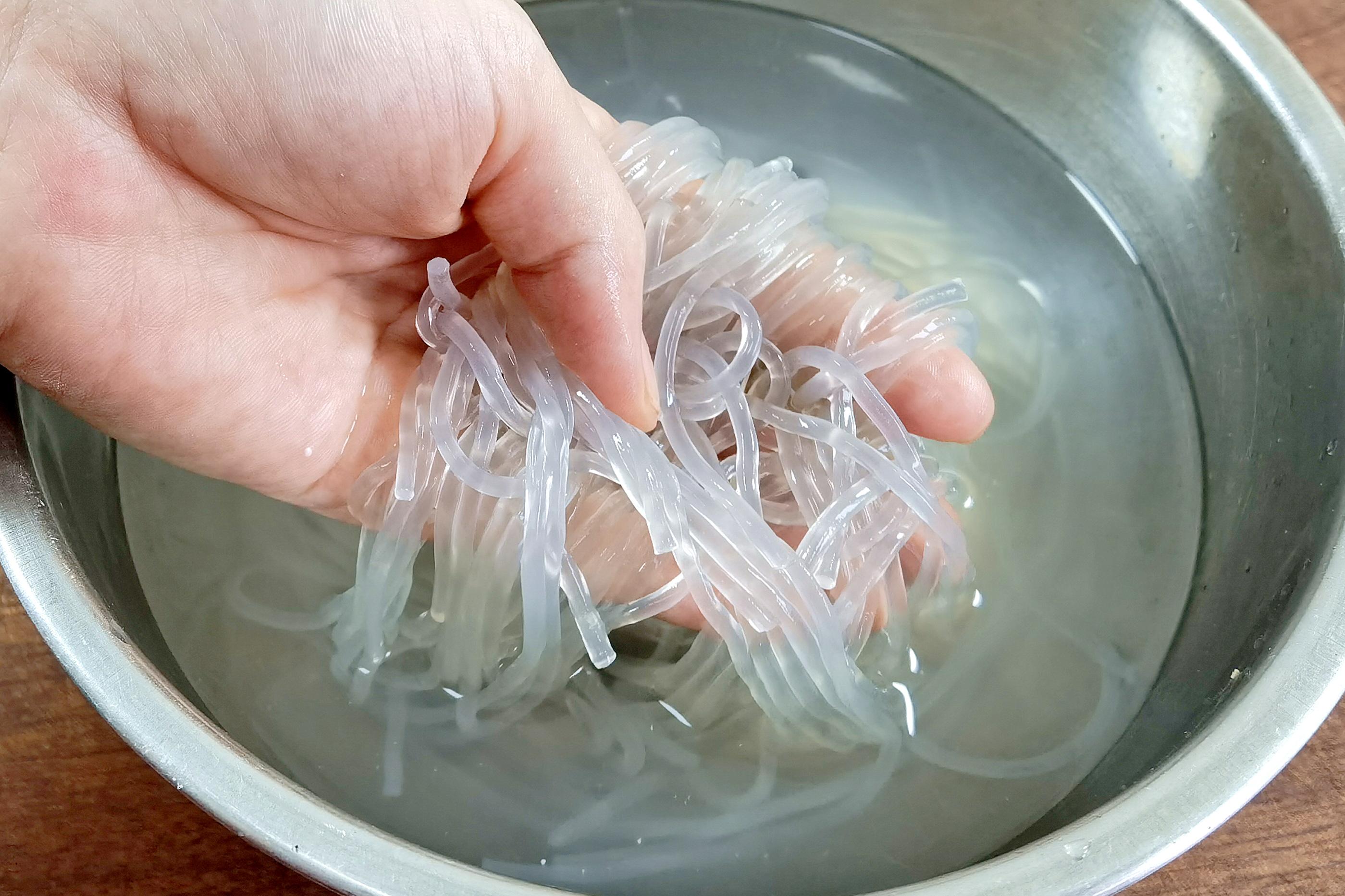 1. 備水:拿個大盆,倒入足以淹沒粉條的溫水(50度左右)。