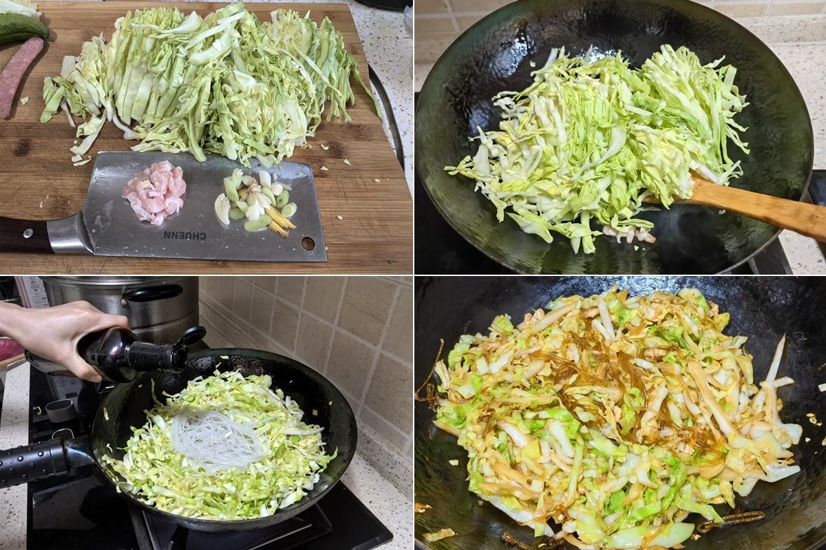 3. 包菜下鍋:倒入包菜絲,轉中大火,快速翻炒。包菜絲炒到稍微變軟、“塌秧”了,就可以進行下一步。把瀝乾水的粉條倒入鍋中。緊接着淋入生抽、老抽、蠔油和白糖。