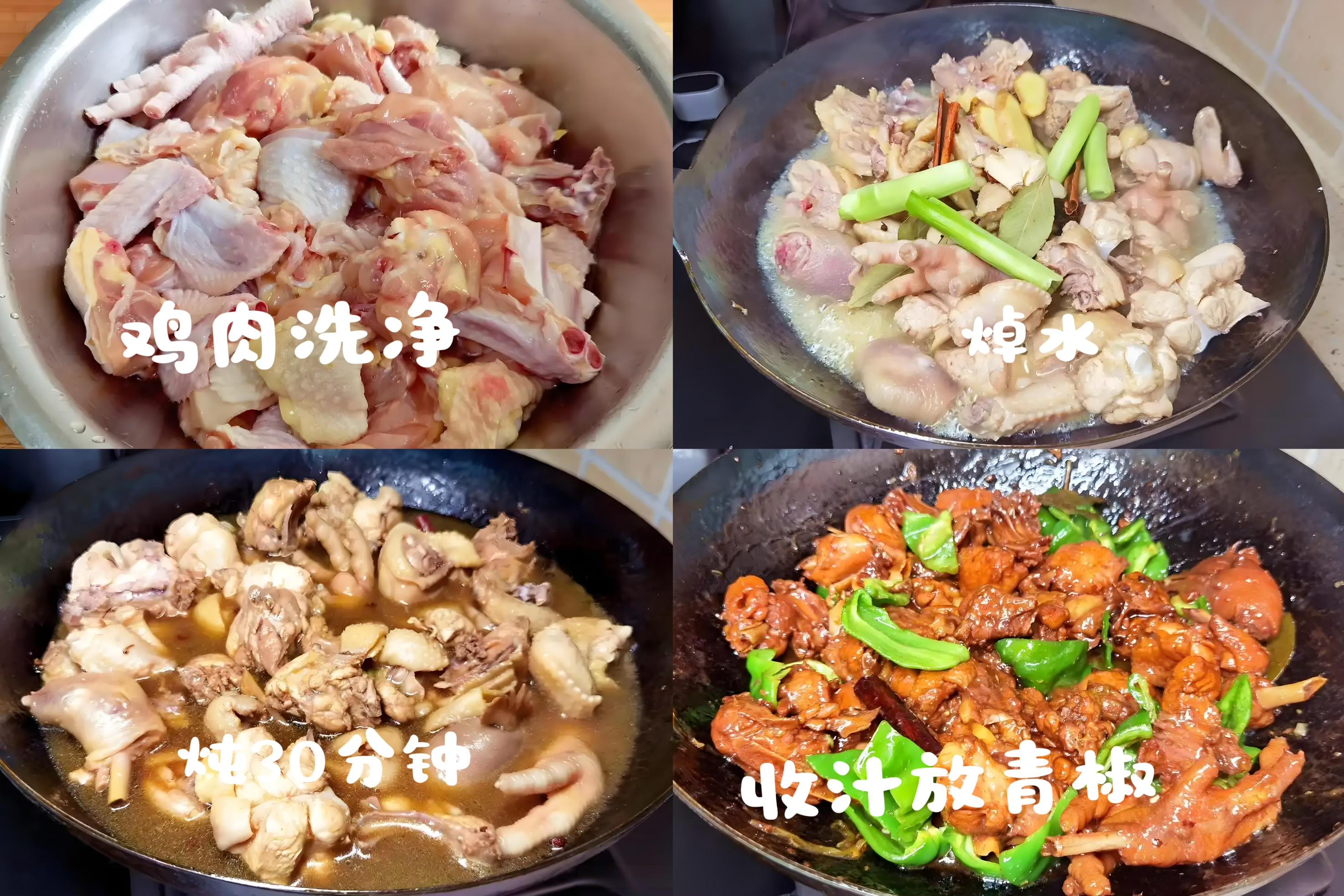 4、倒入開水(或啤酒更添風味)沒過雞塊,大火燒開轉中小火燜煮約20分鐘。湯汁收得差不多時,撒上青紅椒塊翻炒斷生,最後淋點鍋邊醋激香,出鍋!