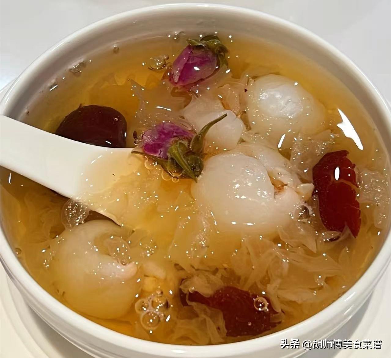 【製作方法】:將銀耳洗淨後放入鍋中,然後加入適量水,將銀耳小火燉30分鐘後,再加紅棗、玫瑰、荔枝放入鍋中,繼續燉15分鐘,時間到後,將黃冰糖放入鍋中,繼續燉10分鐘即可起鍋食用。