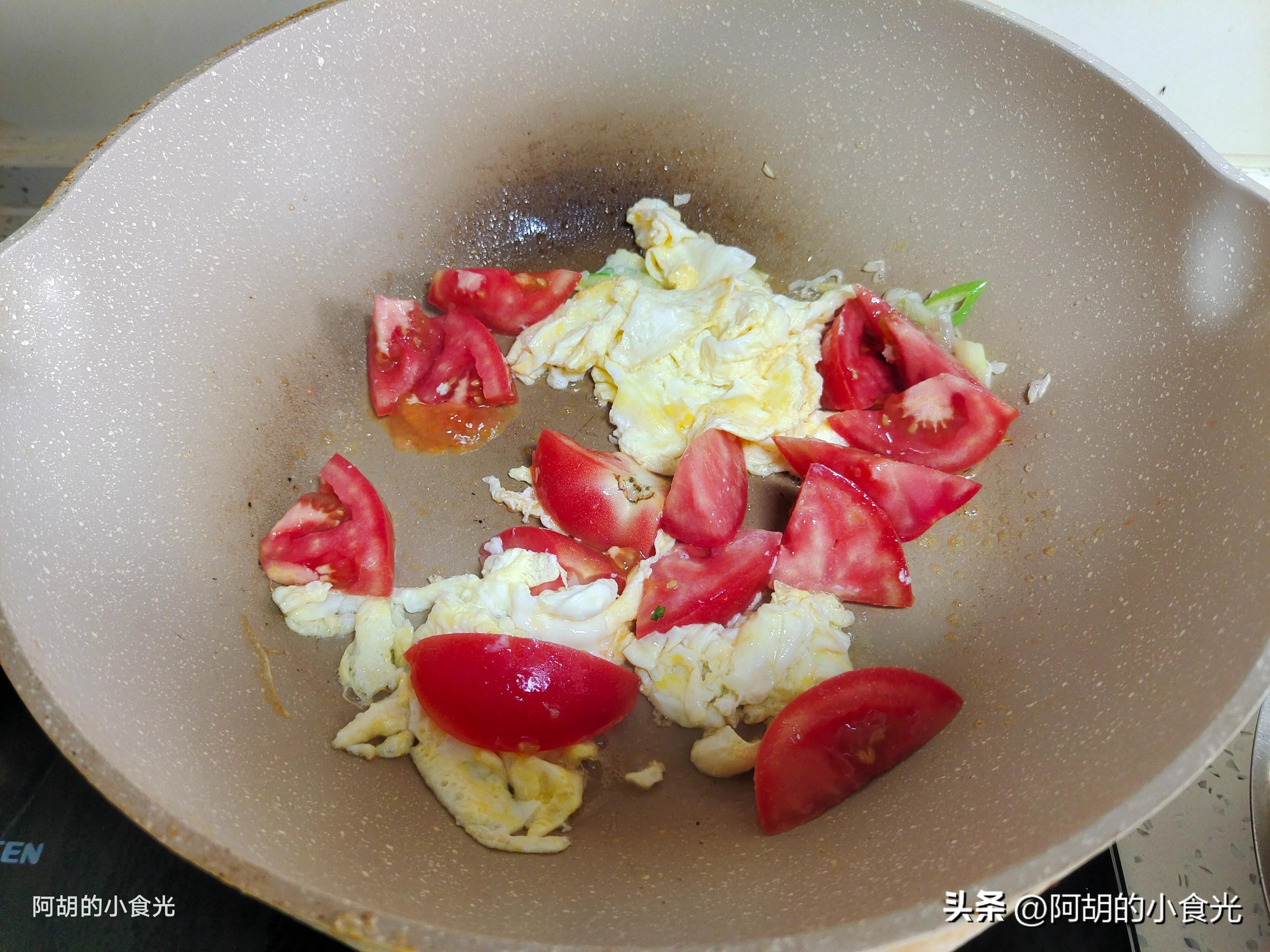 第三步:所有食材準備好後就可以開火烹飪了。先把鍋燒乾,淋入一些食用油燒熱,接着將雞蛋液倒入鍋中,保持中小火煎炒至凝固,再撒入一些蔥蒜炒出香味,接着把西紅柿塊也倒入鍋中,轉爲大火炒一炒。