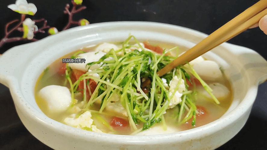 今天這道湯的食材有四個,分別是豌豆苗、魚丸、雞蛋和西紅柿,其中的豌豆苗也叫做龍鬚菜,營養豐富,口感脆嫩,也是今天這道湯菜的主角。再輔以魚丸、雞蛋和西紅柿來提鮮增味,爽口開胃的同時又不失鮮美之味,值得各位試一試。