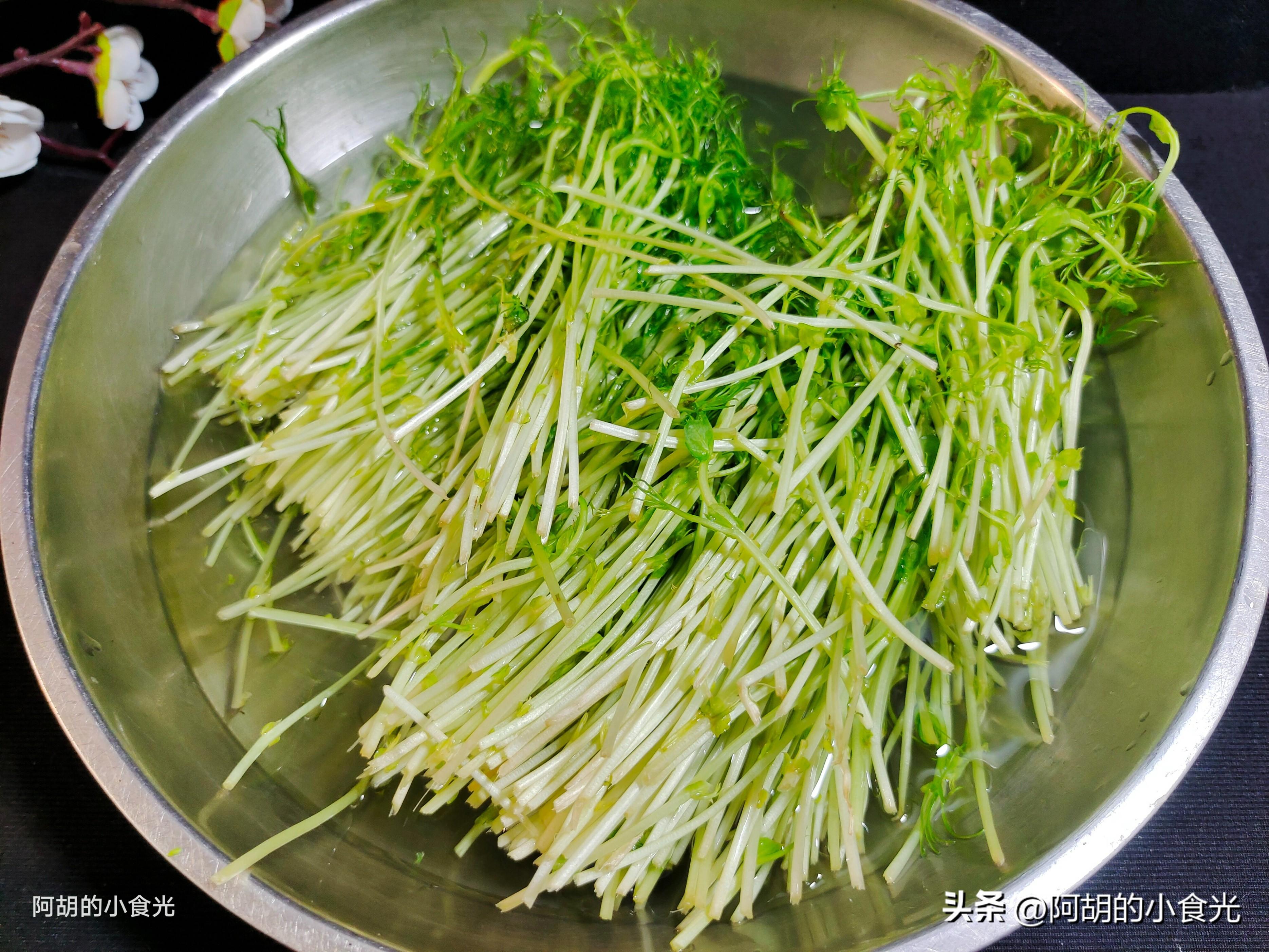 第一步:今天所用得最主要得食材就是豌豆苗,這個豌豆苗是菜市場採購得盒裝豆苗,買回來後簡單浸泡清洗後就可以拿來烹飪,浸泡可以讓其吸收一些水分,讓其口感更鮮嫩一些。有條件的也可以自己試着在家培育一番,也比較簡單。