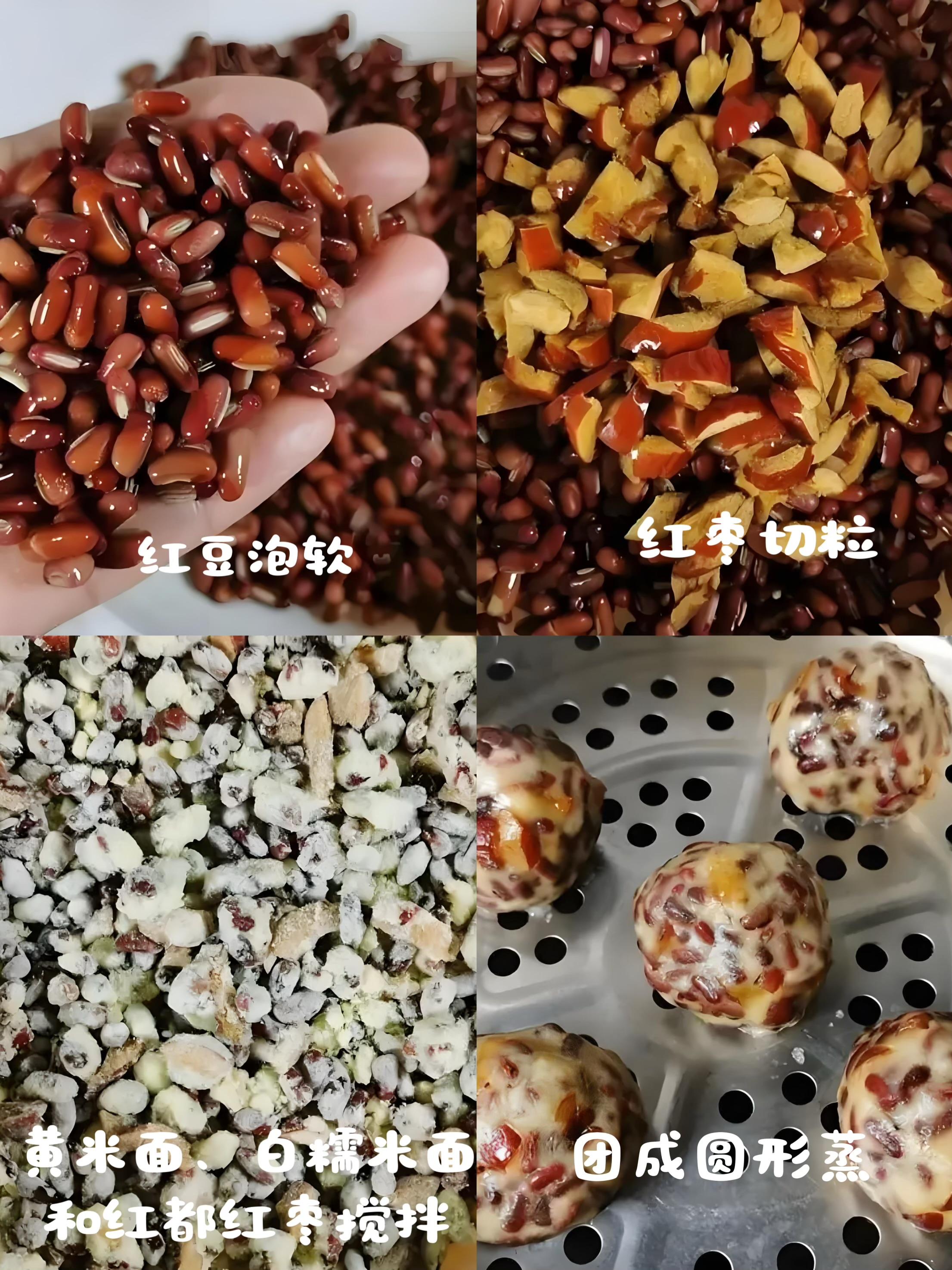 2、糯米粉和大黃米麪混合均勻,放紅豆和紅棗碎揉成麪糰,醒10分鐘。