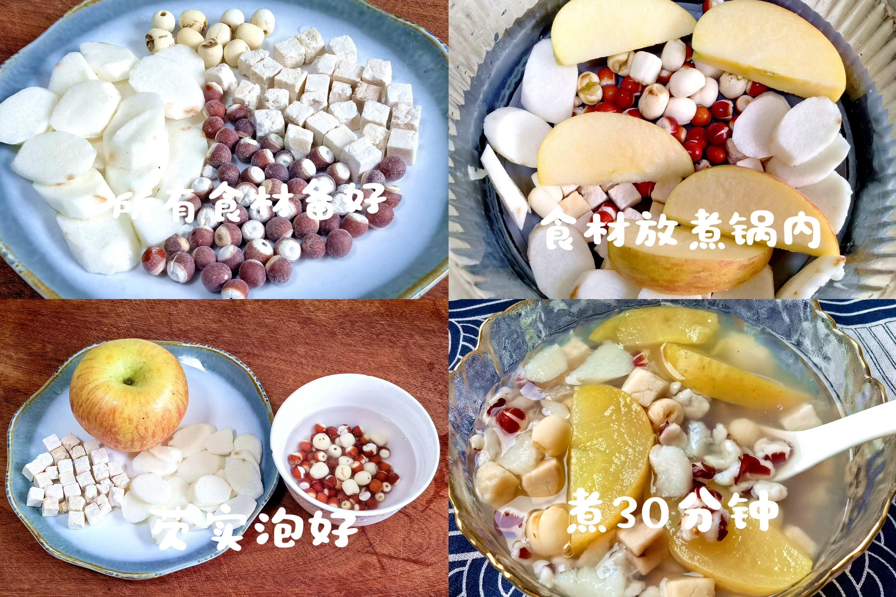 4. 加入1個去核切塊的蘋果(無需去皮),繼續煮10-15分鐘即可。可加少量冰糖或黃冰糖調味,或待溫熱後調入少許蜂蜜。