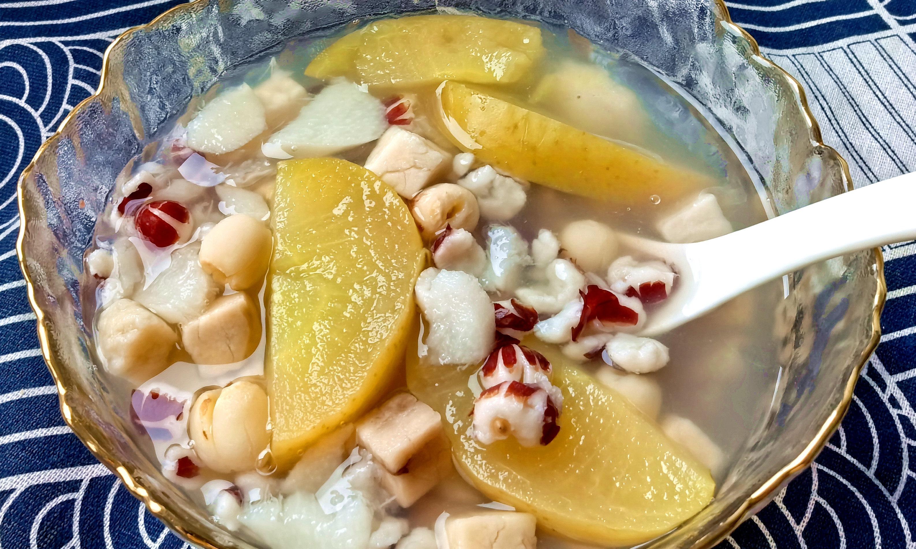 此湯是經典的健脾祛溼方“四神湯”的溫和變奏。蘋果的甘潤完美化解了藥材的澀感,讓湯水清甜適口,脾胃虛弱、易脹氣、舌苔白膩者尤其適合。煮好後滿屋都是蘋果混合山藥的清甜香氣,喝下去脾胃暖融融的,特別舒服。