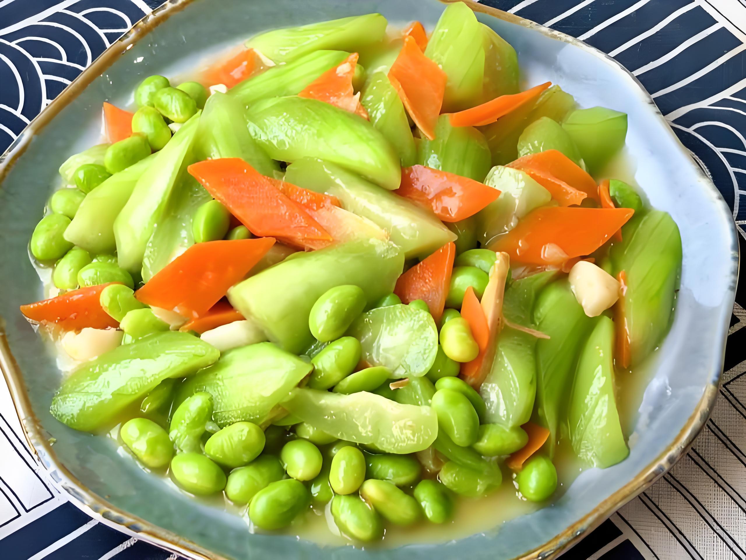 6、加入焯過水的胡蘿蔔丁和毛豆仁,一起翻炒均勻。 加入鹽、少許蠔油(如果用),快速翻炒均勻。如果鍋太乾,可以沿着鍋邊淋入一點點熱水。炒至所有食材熟透(絲瓜變軟透明),即可出鍋。