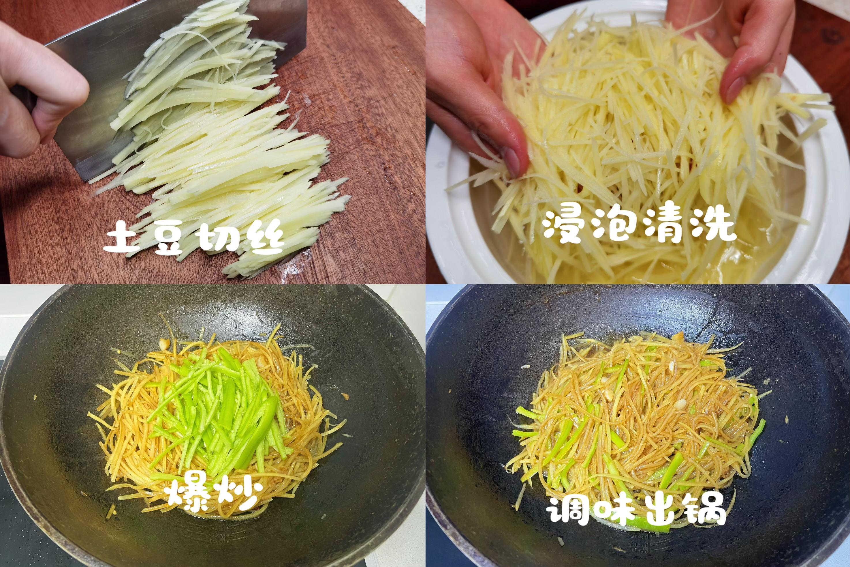 4、撈出土豆絲瀝乾水分(這點很重要!),迅速倒入鍋中,開大火快速翻炒。