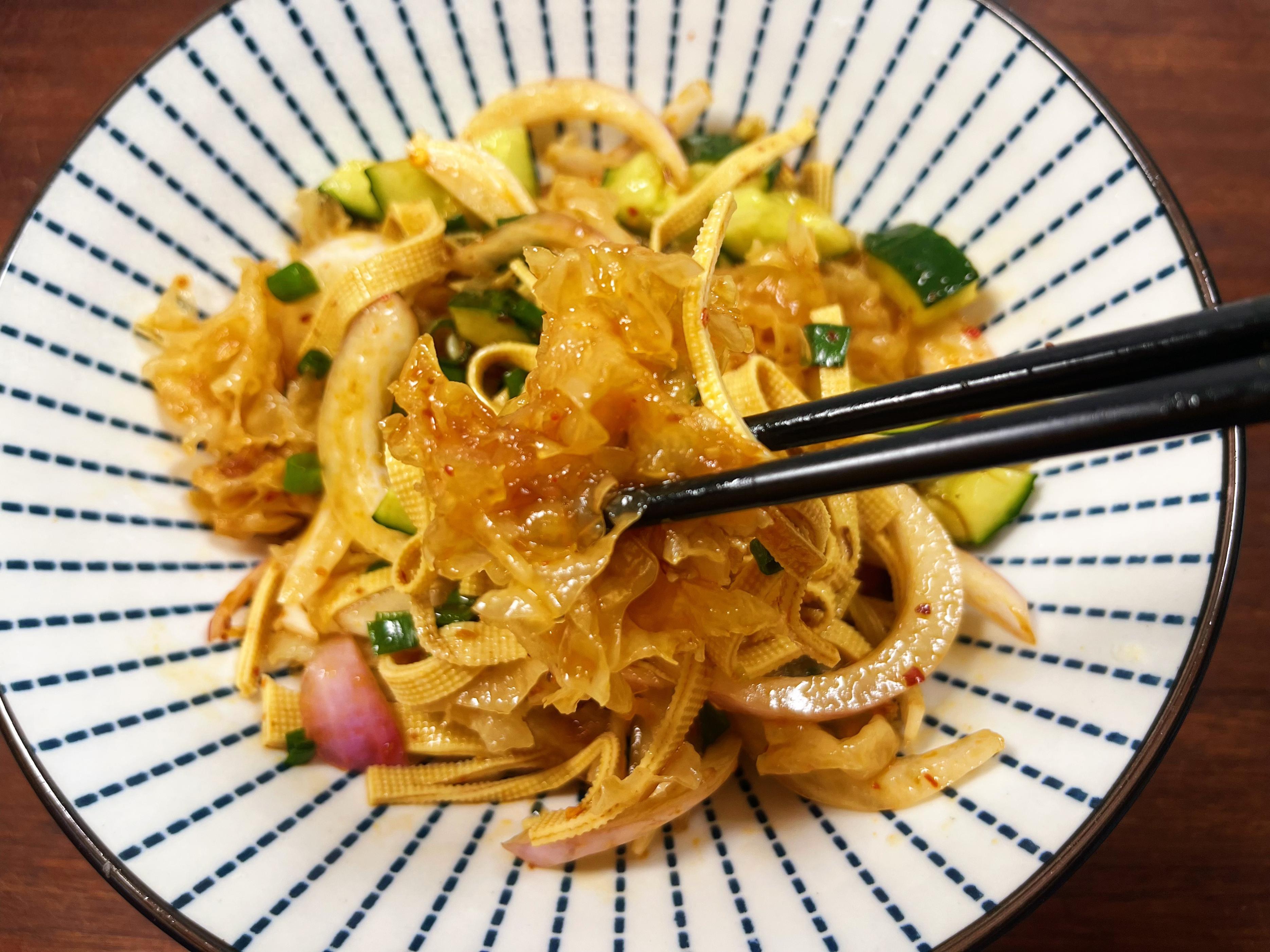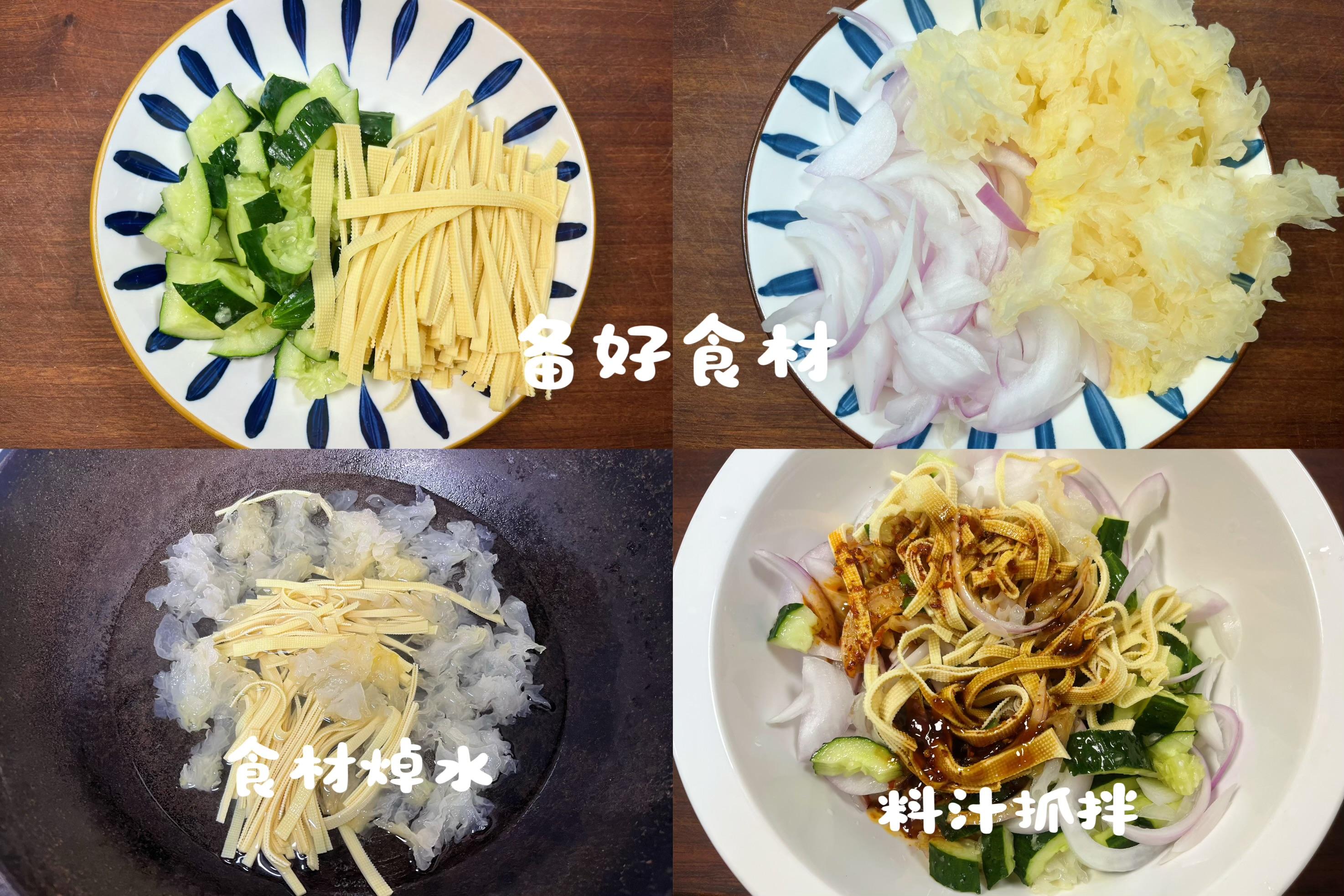 泡發好的銀耳膠質豐富,口感滑中帶脆,自帶天然清潤感。黃瓜的爽脆和豆腐皮的柔韌完美融合。焯水後的銀耳和豆腐皮更清爽衛生。調味以酸香爲主,微微帶點甜,特別開胃解膩。