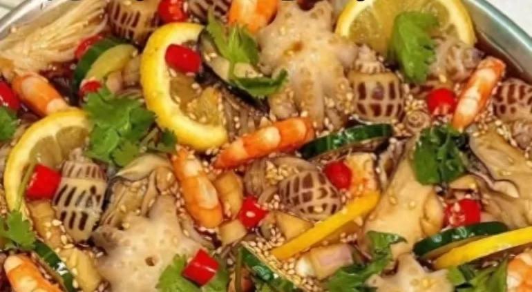 1. 小海鮮洗淨,冷水下鍋,加薑片、料酒,煮至熟透後撈出過涼水,瀝乾水分。