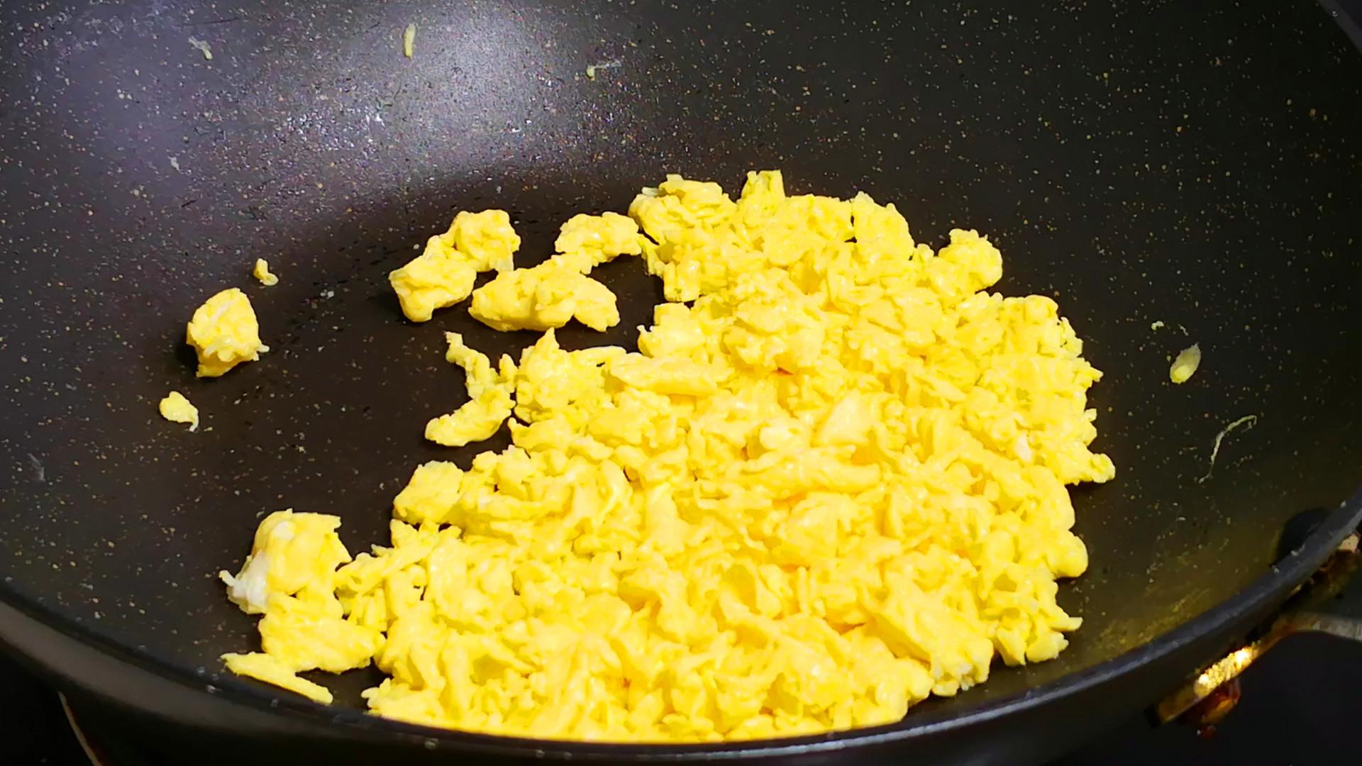 2、準備輔料:鮮蝦去掉蝦線後剝掉蝦殼,洗淨後切成小丁放入碗中,然後加入適量的料酒醃製備用;再取3雞蛋打入碗內,少加一點點鹽和料酒,順着一個方向打散,再起鍋加油,倒入蛋液,把它煎成大小均勻的雞蛋碎後關火,盛出備用。