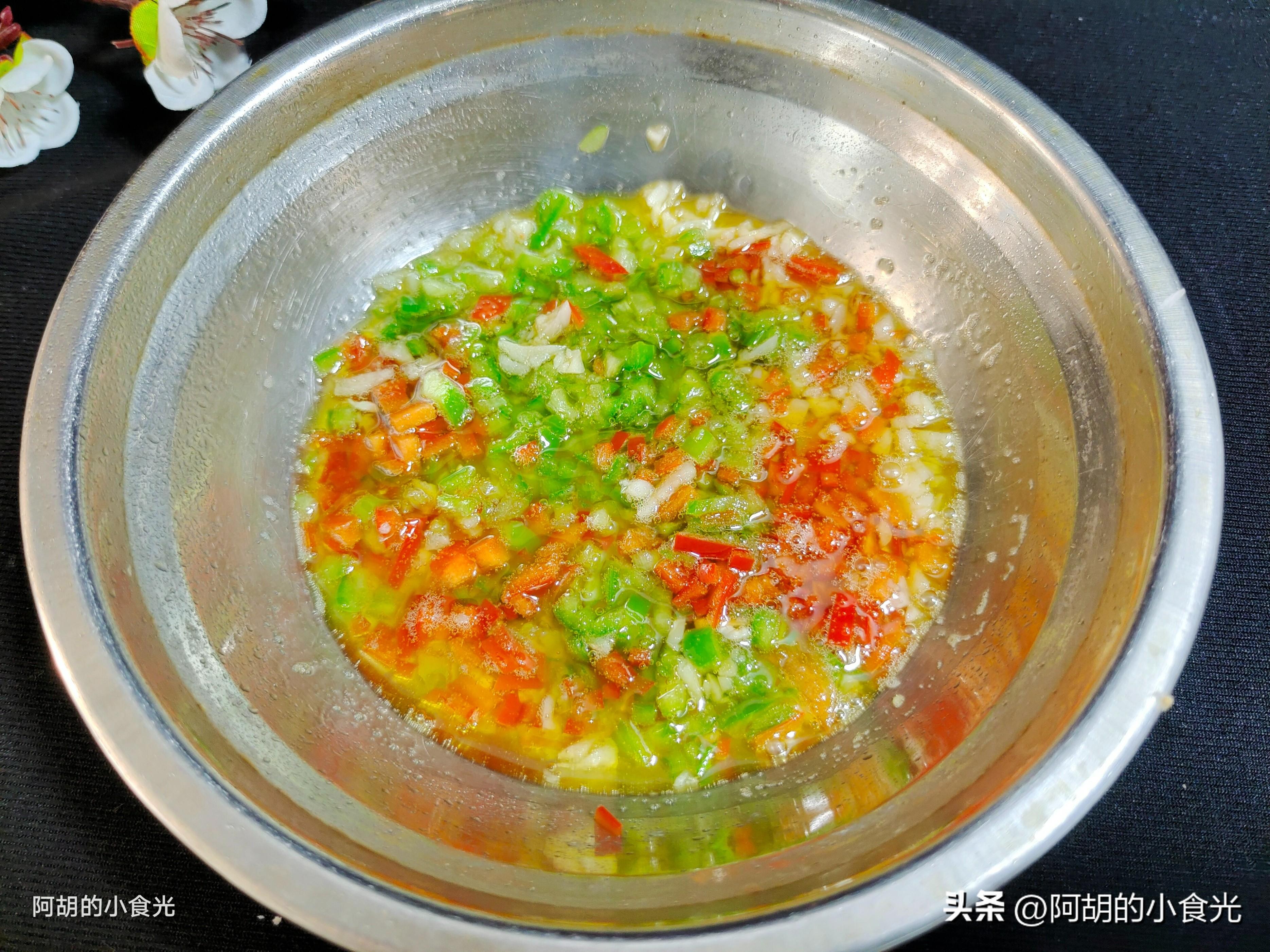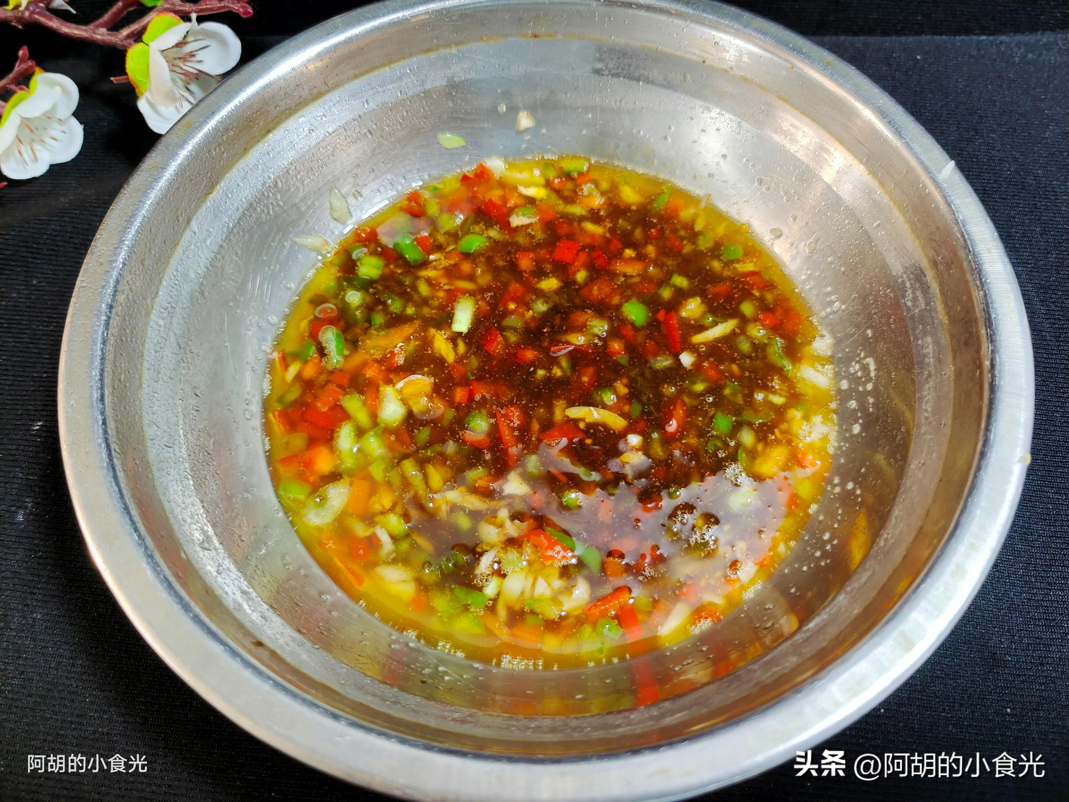 第二步:再提前準備一個料汁,一個空碗中加入青紅椒碎、大蒜末適量,而後燒一些菜籽油至微微冒煙,將熱油直接澆入碗中激發出青紅椒和大蒜的香味。接着淋入兩湯匙的蠔油、適量的生抽、食鹽和松茸鮮攪拌均勻即可。