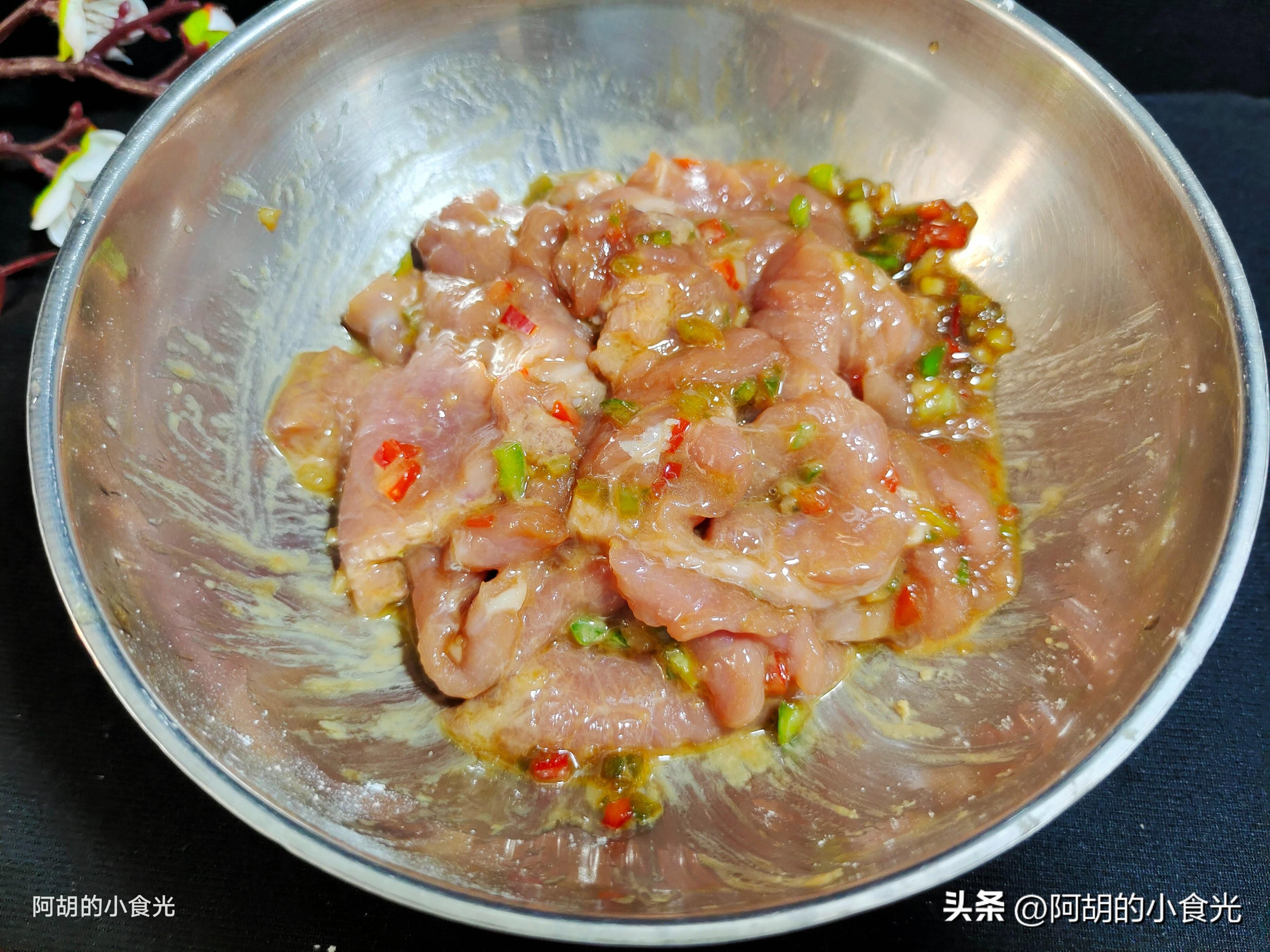 第三步:準備一塊豬瘦肉,最好用梅花肉的瘦肉部位,口感比較嫩一些。將瘦肉切片後放入碗中,取出上一步中調製好的料汁直接倒入肉片中,戴好一次性手套下手多多地抓一抓,讓肉片吸收料汁的味道。最後加入少許的幹澱粉再次抓勻,置於一邊等待十分鐘後使用。