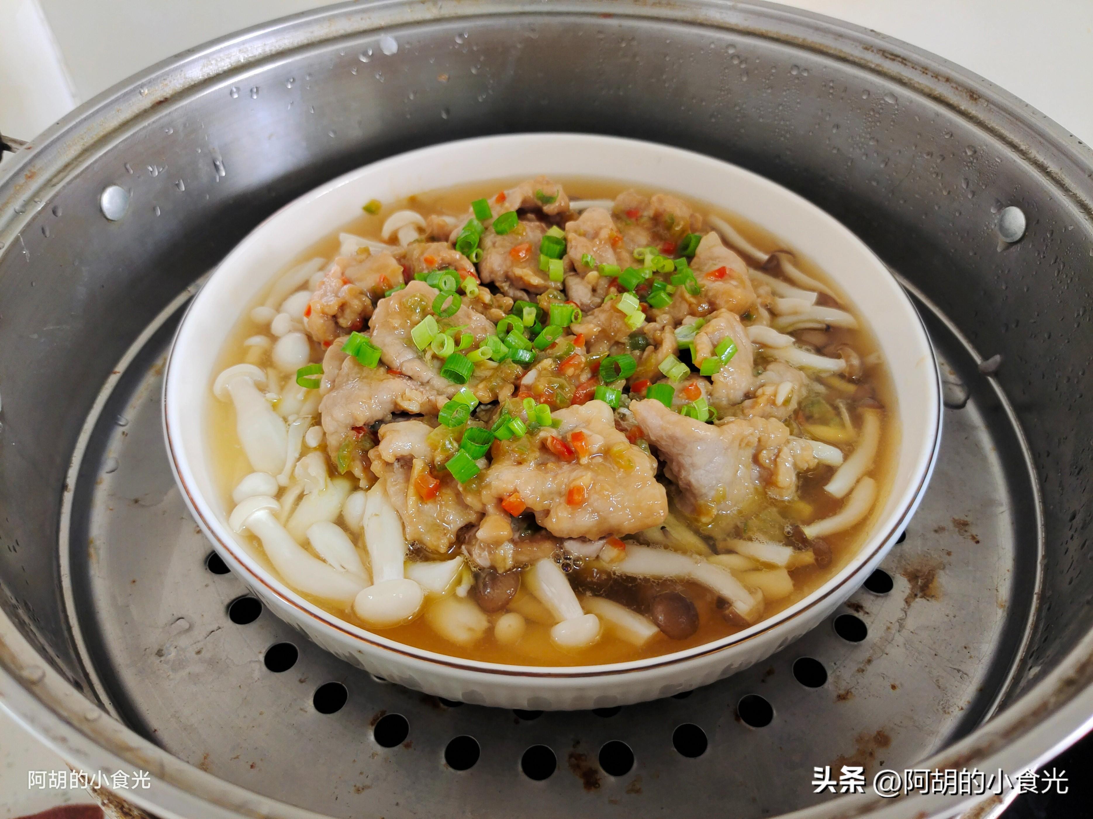 第五步:蒸鍋內用涼水,把盤子上鍋後加蓋開大火開始蒸。觀察鍋內上汽後開始計時,差不多十分鐘左右就可以關火了,最後再撒入一把小蔥花點綴提味,加蓋再燜各一分鐘就可以出鍋享用了。肉片極致的滑嫩,濃濃的椒香味特別的開胃,蘑菇吸收了肉汁的滋味更是鮮滑爽口,妥妥的下飯好菜,感興趣的務必要試一試這個做法。