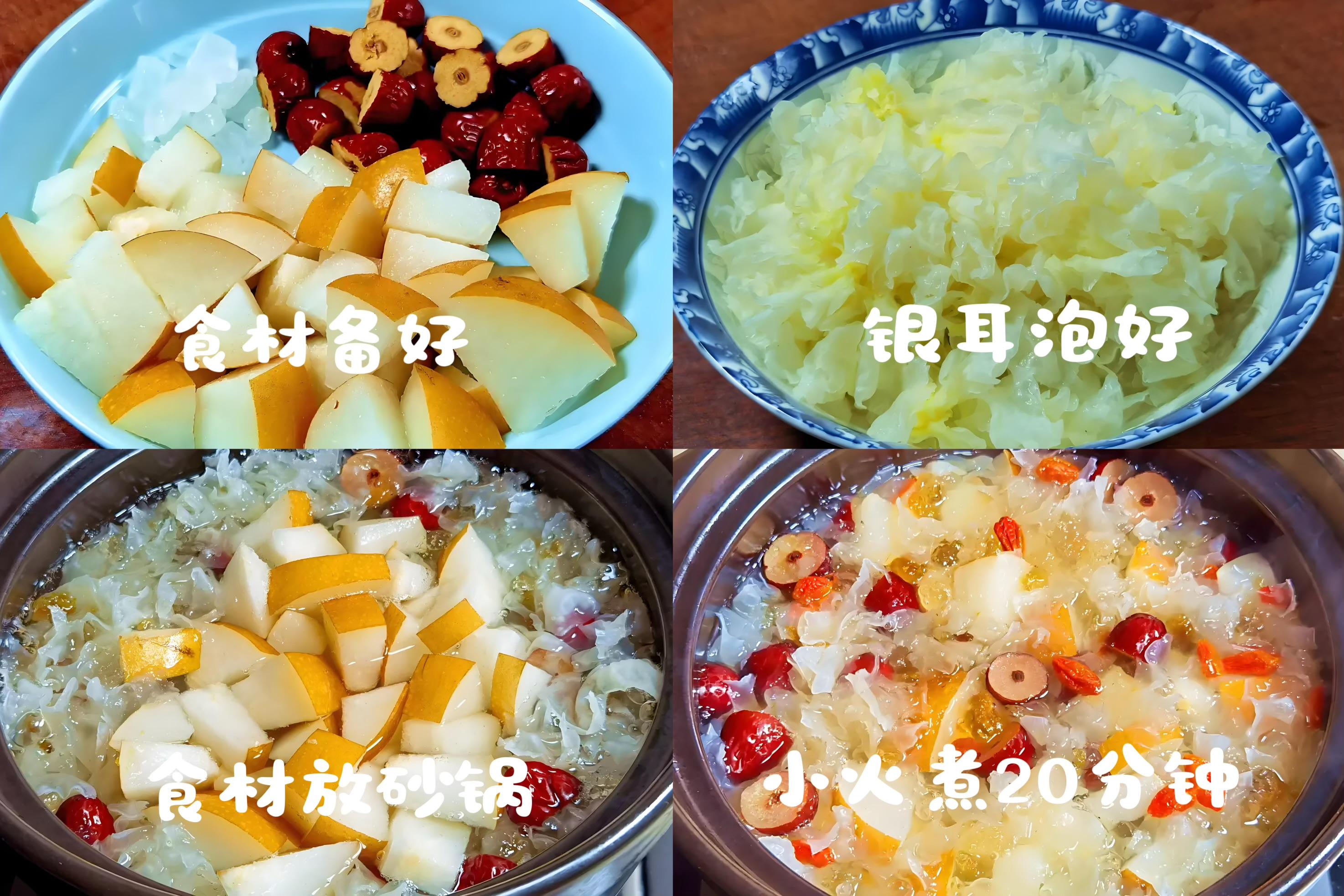 1、銀耳用涼水泡發(至少1小時),泡軟後去掉根部黃色硬蒂,撕成小朵。紅棗洗淨去核。秋梨洗淨去皮去核,切成滾刀塊。枸杞洗淨。