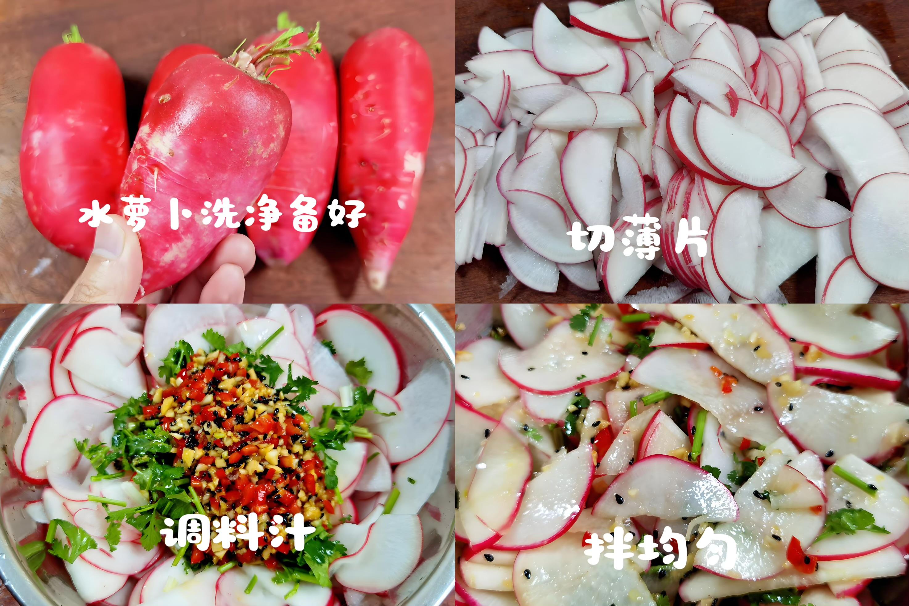 1、水蘿蔔洗淨,去掉頭尾。用刀拍扁(或者切薄片),這樣更入味。拍好的蘿蔔放碗裏,撒一小撮鹽,抓勻醃10分鐘,殺出些水分,倒掉(這一步讓蘿蔔更脆,去掉生澀味)。