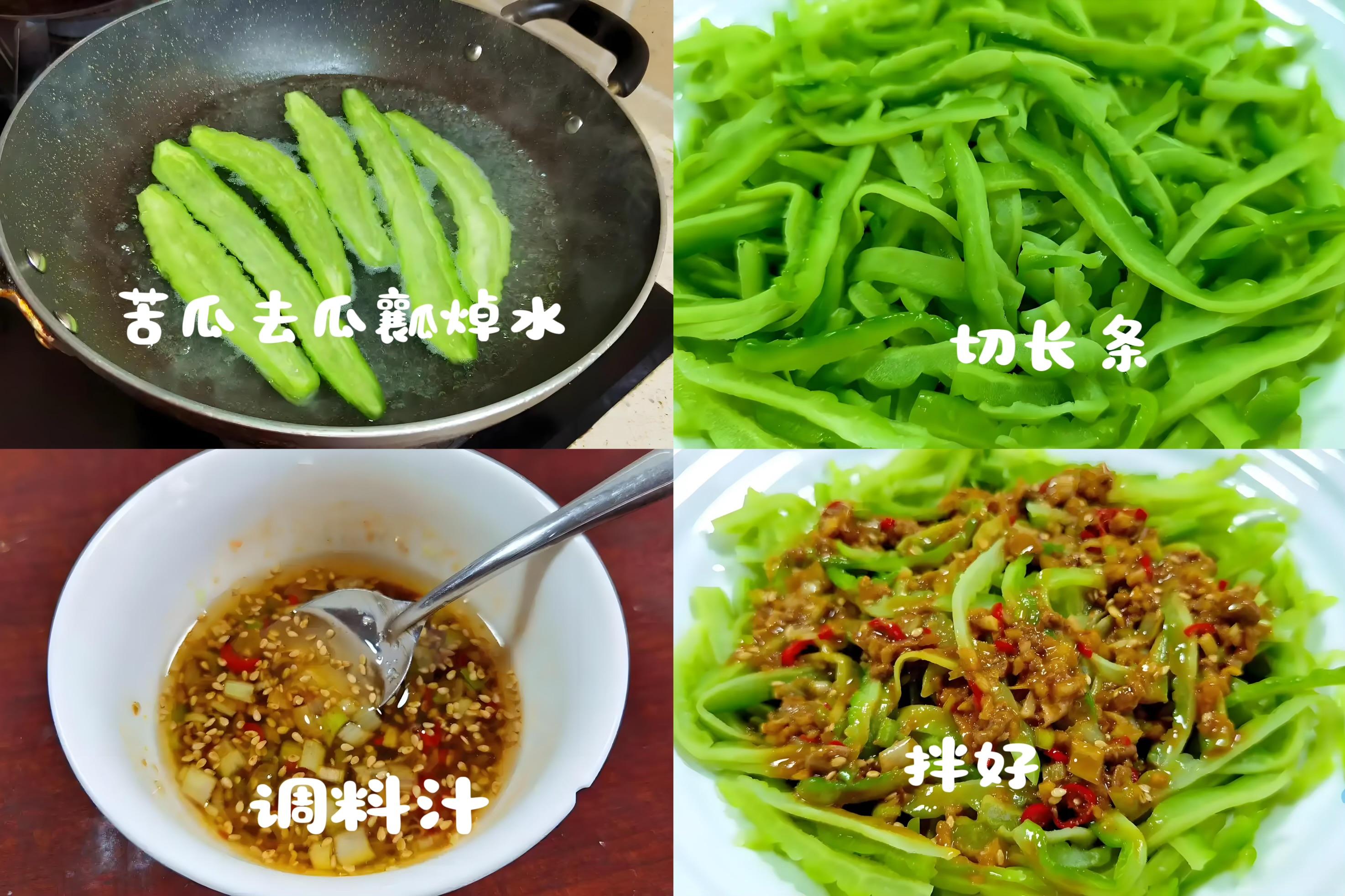 1、苦瓜洗淨,對半切開,用勺子刮掉白瓤(越乾淨苦味越淡),切成薄片。講究點的姐妹,可以燒一鍋水,滴幾滴油,水開焯燙苦瓜片20秒左右撈出,迅速過涼水(這樣更翠綠爽口,苦味也柔和)。怕麻煩的直接生拌也行,更“敗火”!