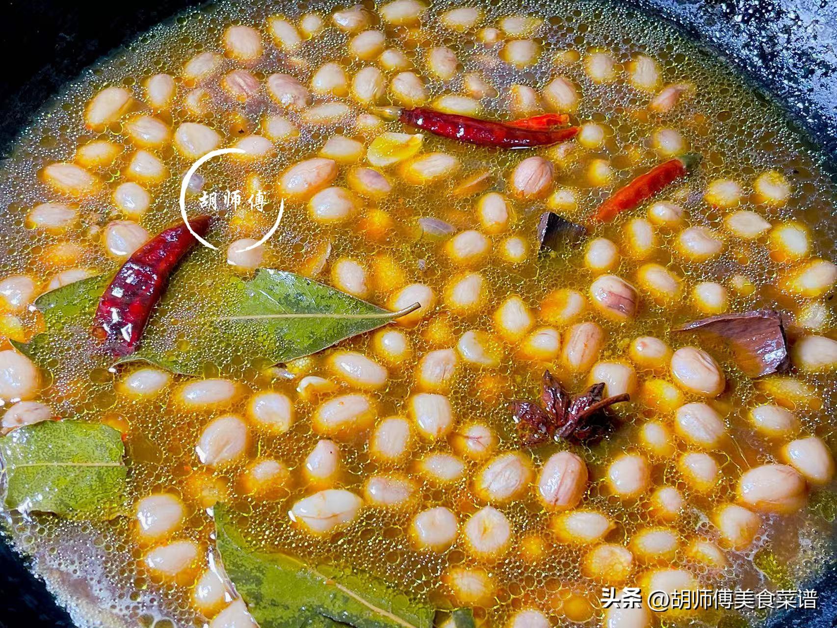第三步:鍋中放入適量水,等水煮沸後,將花生米、幹辣椒、八角、桂皮、花椒、香葉、老抽、冰糖、食鹽全部都放入鍋中,中火將花生米煮15分鐘後關火,然後將花生米浸泡1小時後撈出,這樣可以使花生米喫着更入味。