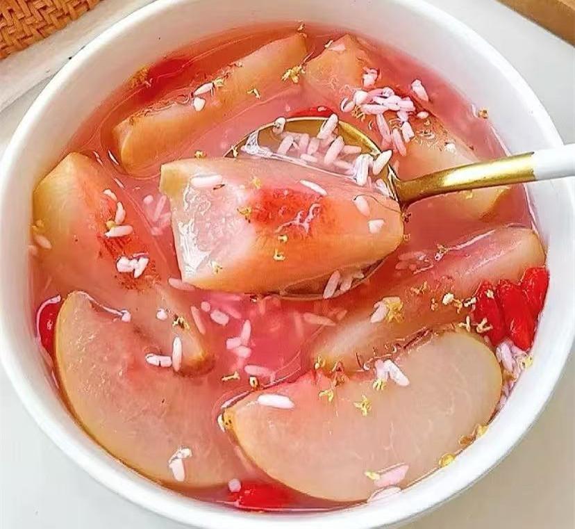 【食材準備】:桃子2個、酒釀100克、枸杞、冰糖適量。