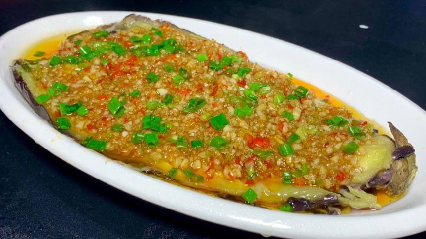 2、茄子已經蒸好了,給它劃幾刀方便入味,鋪上調好的蒜蓉,蓋上蓋子再蒸三分鐘,讓茄子入味。時間到澆上蒸魚豉油,撒上蔥花,澆上熱油激發出香味,一道非常好喫的蒜蓉茄子就做好了。