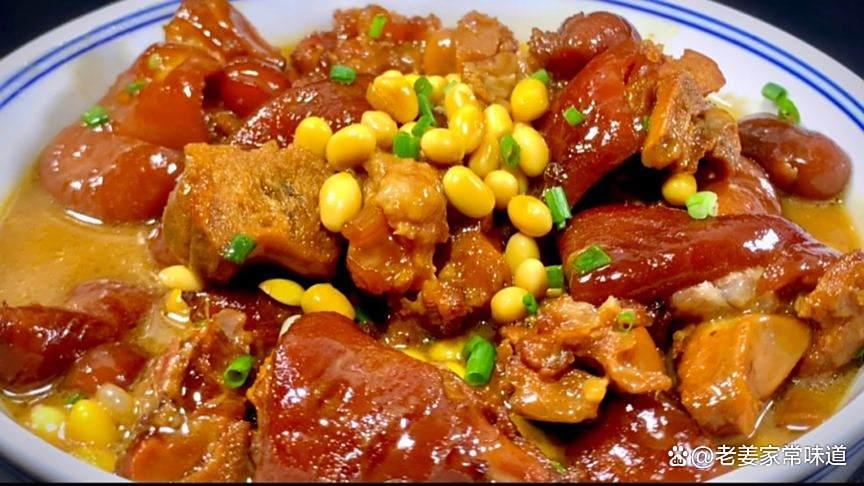2、起鍋把姜蒜炒香,把豬腳放進來炒出蒜香味,放生抽,一瓶啤酒,一碗開水,黃豆,食用鹽,小火燜熟爲止。