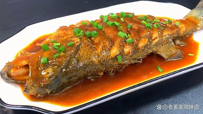 3、鍋中的湯汁已經不多了,把魚撈出來,把湯汁收濃稠一點,均勻的淋在魚上面,撒上小蔥花,紅燒魚就做好了。