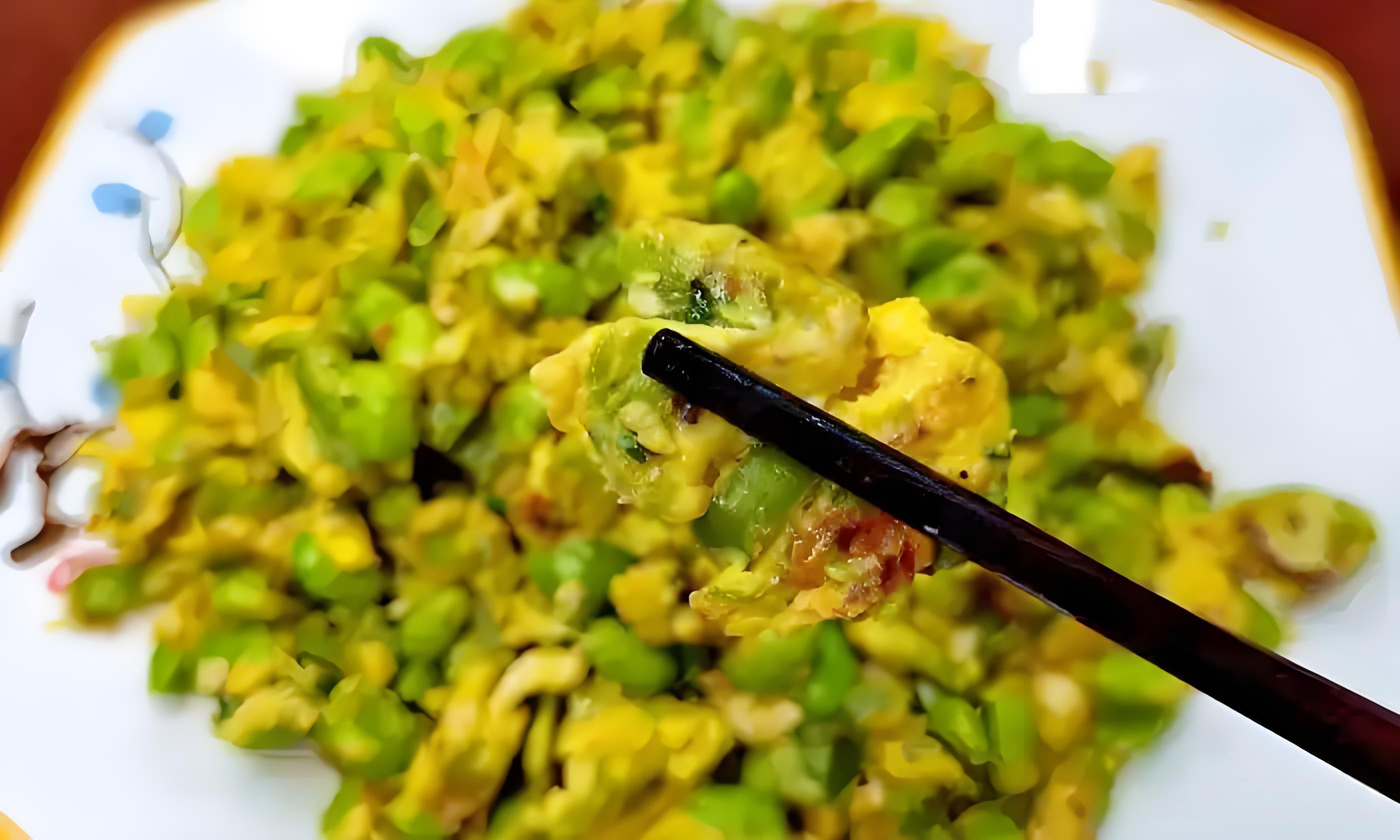 4、用鍋鏟快速翻炒,蛋液一遇熱就迅速凝固,包裹着翠綠的豆角粒。等蛋液基本凝固成形,豆角也熟透了,沿着鍋邊淋入小半勺生抽提個鮮味兒,再快速翻炒幾下。聞到誘人的香氣,豆角粒熟透、雞蛋金黃蓬鬆,立刻關火裝盤!