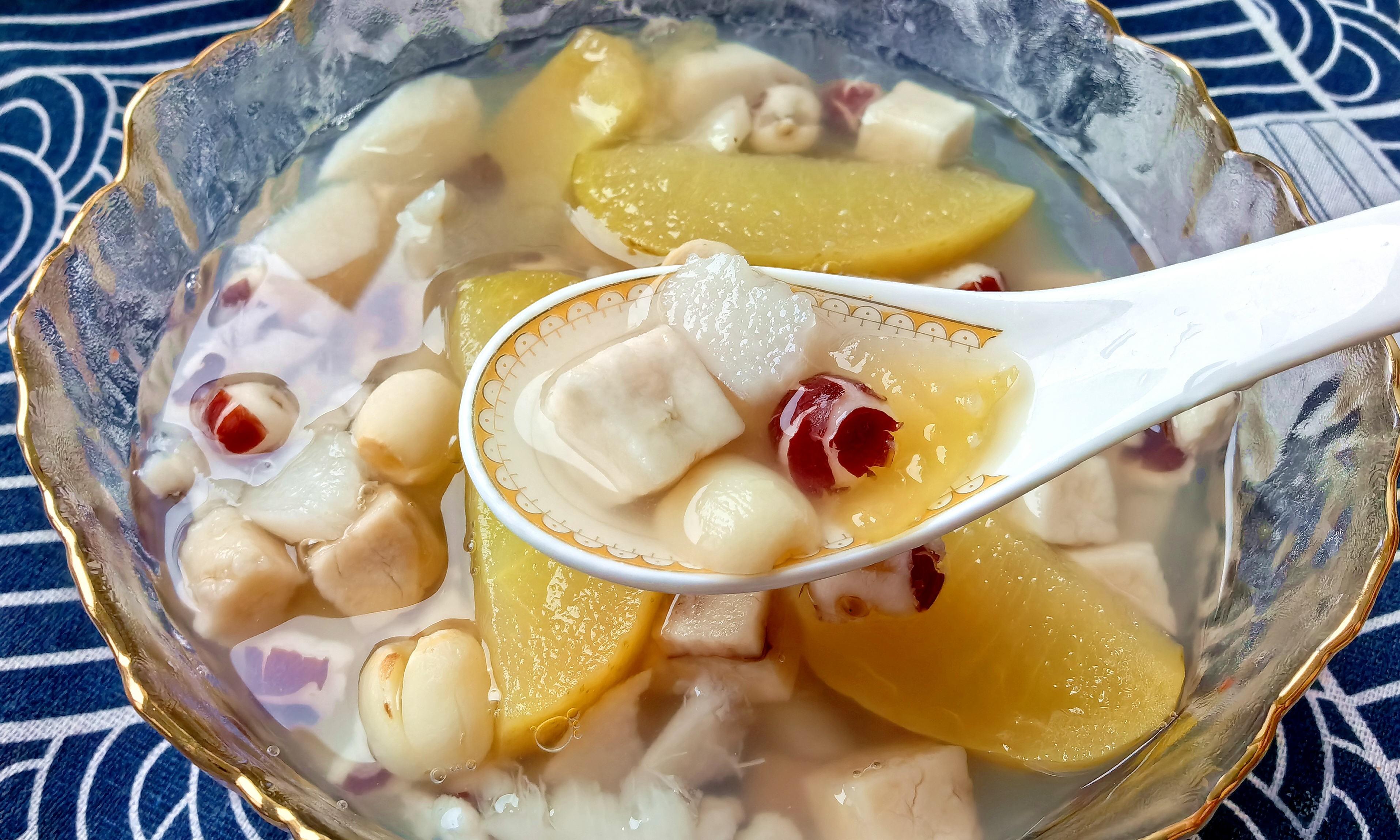 山藥、茯苓、芡實、蓮子,個個是健脾祛溼的能手,合力把困住身體的溼氣化開運走。蘋果不僅帶來清甜果香,更能生津解渴。一碗下肚,從內到外的黏膩感消散大半,脾胃也像被溫柔地托住了,疲憊感自然減輕。