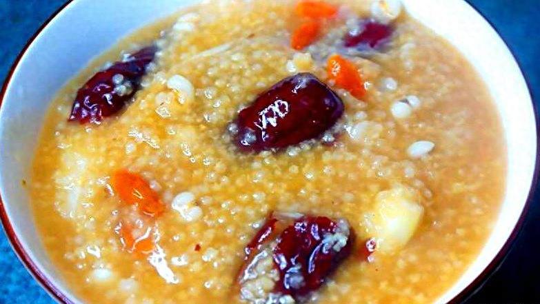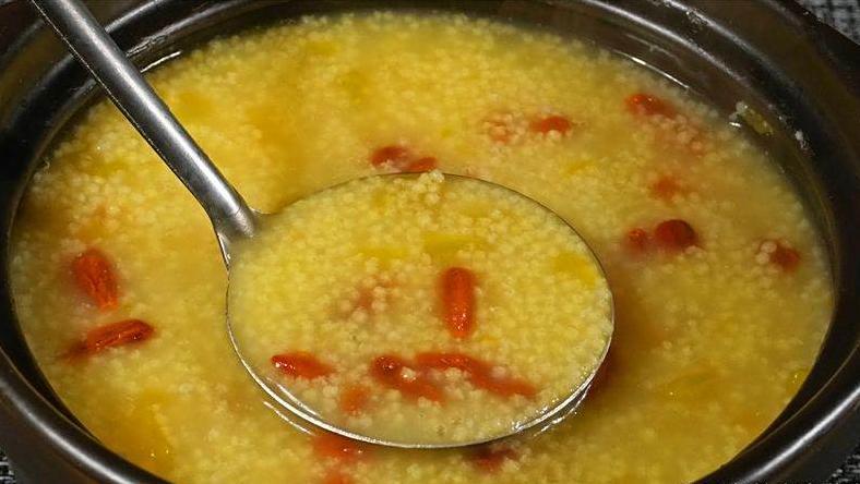 南瓜切成小塊,紅棗去核切成小丁。在砂鍋中倒入適量清水,加入南瓜,大火燒開。加入小米後再次煮開,撇去表面的浮沫,轉小火慢熬20分鐘。加入紅棗碎、枸杞攪拌,再小火熬十分鐘即可。