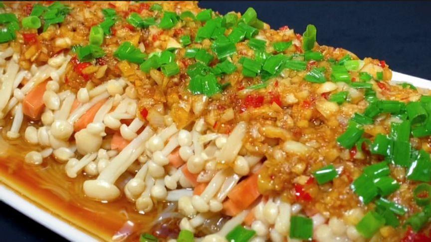 4、鍋裏水燒開,放入電蒸鍋,蓋蓋大火蒸十分鐘,蒸至金針菇熟透後取出,再淋上蒸魚豉油,撒上蔥花,最後澆上熱油激發香味,就可以開喫了。