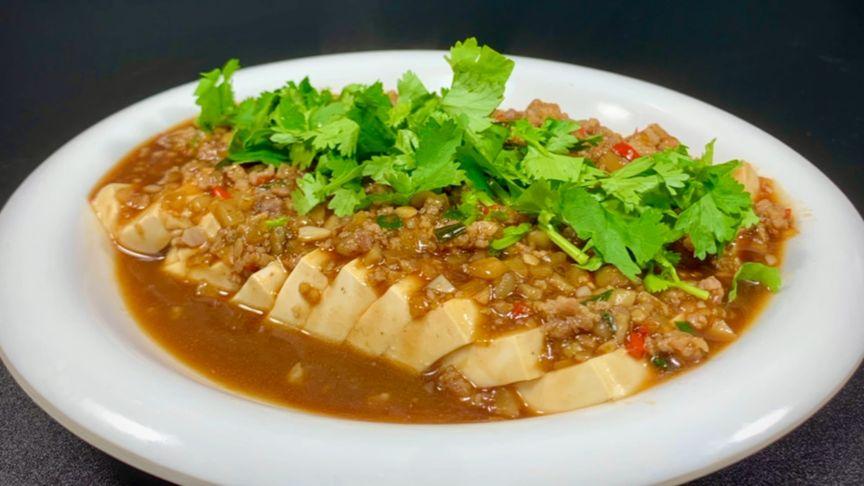 2、浸泡好的豆腐,切厚片,裝入盤子裏面,浸泡好的榨菜切成丁,蒸鍋裏面燒開水,將豆腐放入蒸八分鐘左右,起鍋油熱後,把肉末炒散炒香。再下入蔥薑蒜、辣椒炒香,淋入少許料酒去腥,翻炒幾下炒香,加入少許的生抽,蠔油,炒至上色,加入少量的清水,白糖,胡椒粉,雞精,煮好後加入少量的水澱粉,將湯汁收濃稠,最後將蔥花加進來。翻拌幾下。