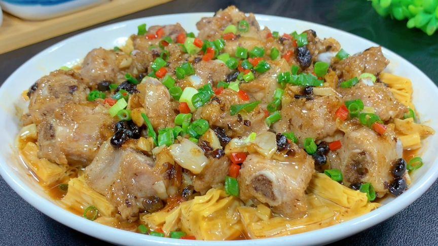 2、蒜子拍扁剁碎,少許黑豆豉,腐竹浸泡好切成小段。排骨加入大蒜、豆豉、生抽、蠔油,食鹽,白糖,雞精,料酒,胡椒粉,老抽,抓拌均勻,再加適量的玉米澱粉,花生油增香,簡單的抓拌幾下。將腐竹平鋪在盤中墊底,將醃製好的排骨擺在上面,最後將豆豉和大蒜均勻的灑在上面。